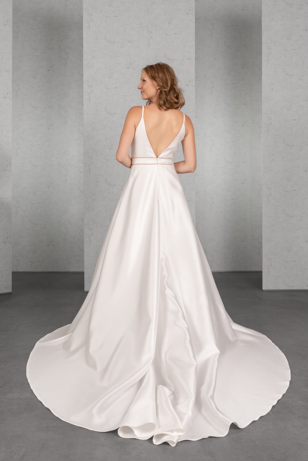Das puristische Brautkleid aus Glitzer-Piqué lässt jede Braut strahlen. Das schlichte Top mit Cut-Out und tiefem Rücken wird durch schmale Träger gekonnt in Szene gesetzt, eine zarte Spitzenborte betont die Taille. Der weite Rock rundet den Look gekonnt ab.