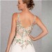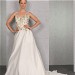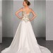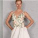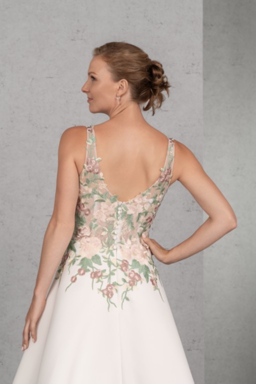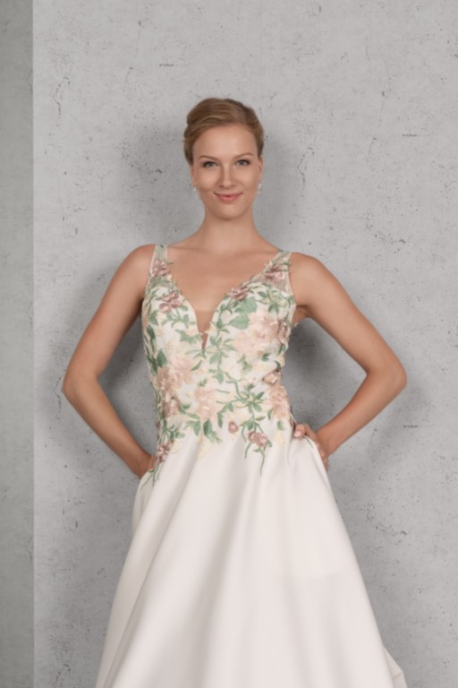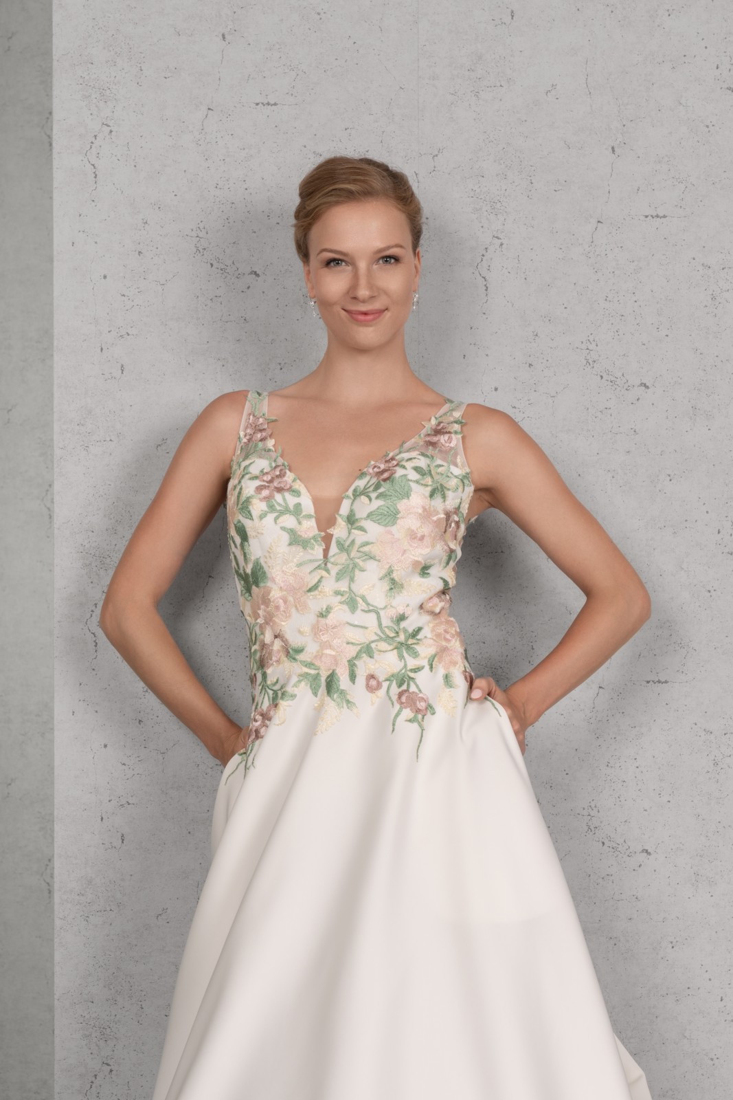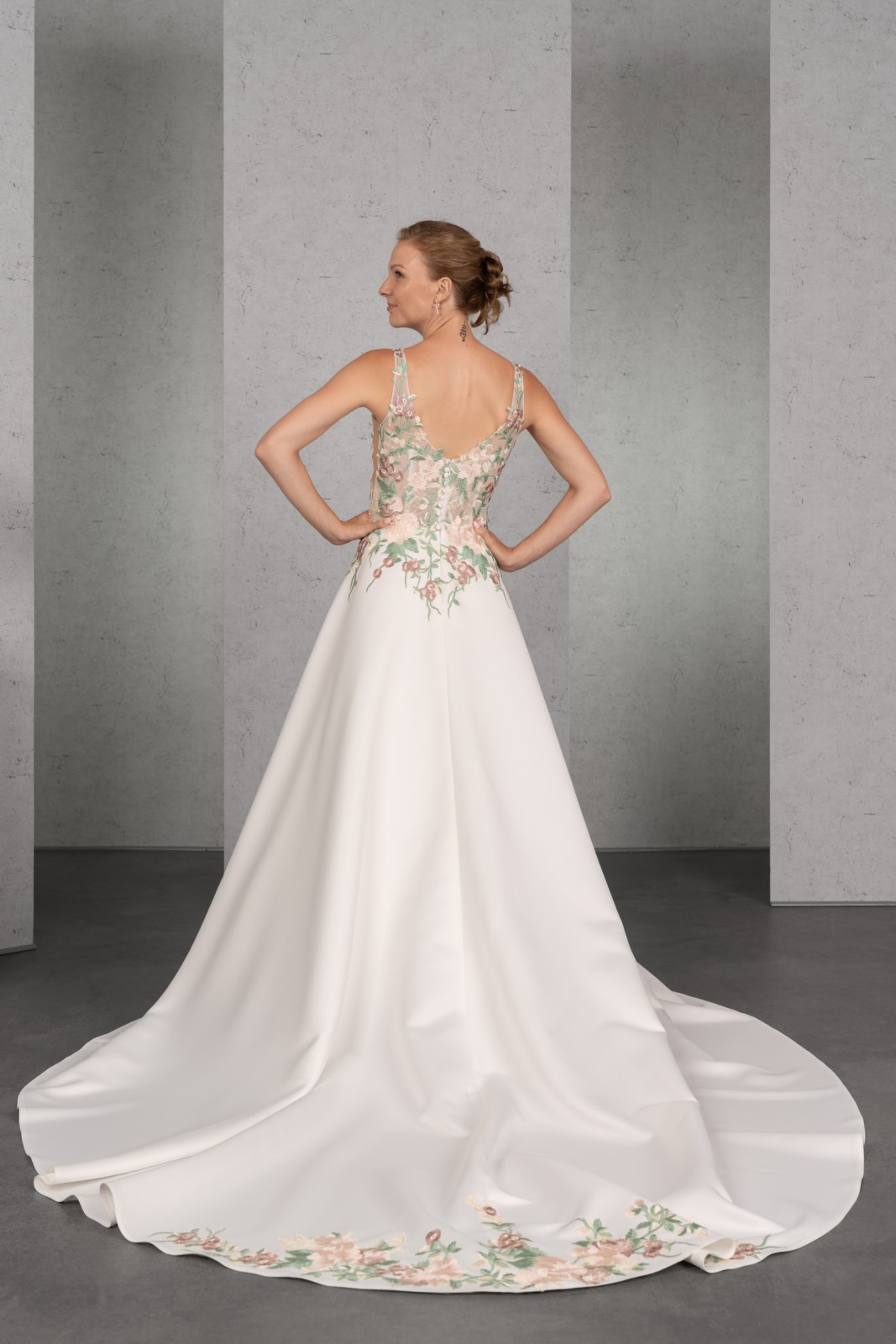 Die zarte Spitze in außergewöhnlicher Farbkomposition sorgt für den besonderen Touch des extravaganten Brautkleides aus mattem Satin. Das Top mit Trägern und transparentem Rücken ist aufwendig mit farbiger Spitze besetzt, die bis in den oberen Rock verläuft. Die üppige Spitzenapplikation auf der Schleppe des weiten Rocks vervollständigt den atemberaubenden Look.