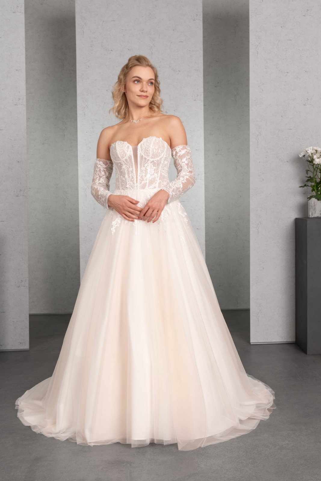 Das transparente Top mit taillentiefem Cut-Out und sichtbaren Stäbchen ist aufwendig mit perlenbestickter Spitze besetzt. Die abnehmbaren langen Ärmel und der geschnürte Rücken sind ein besonderer Blickfang, der weite Tüllrock vervollständigt das romantische Brautkleid perfekt.