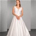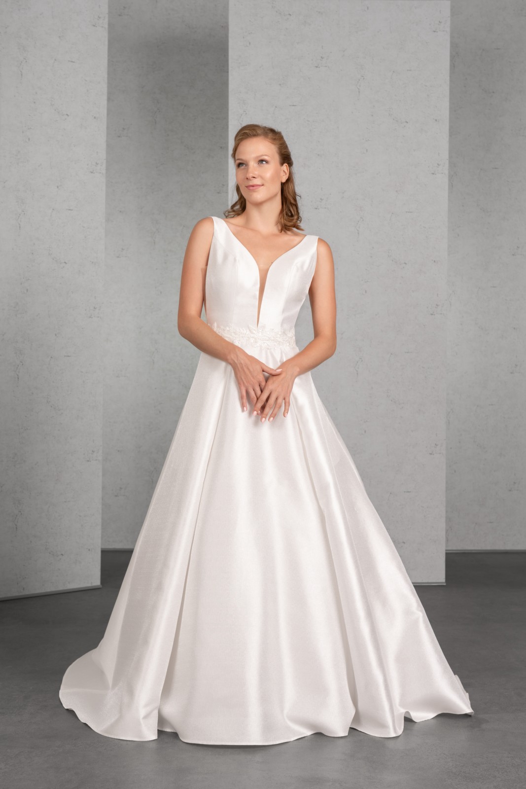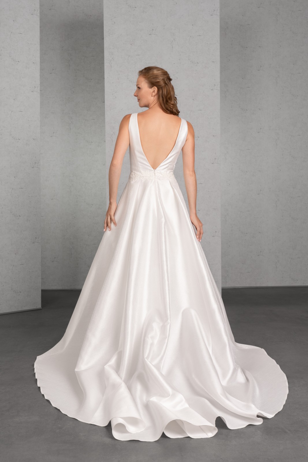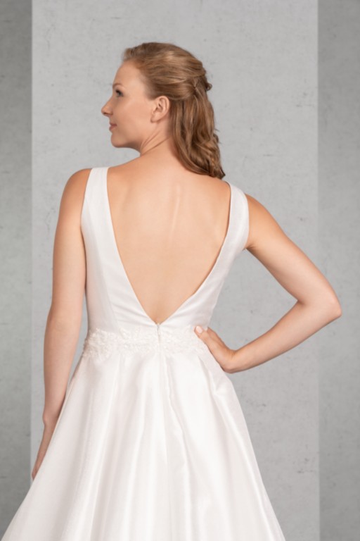 Das außergewöhnliche Material in Leinenoptik mit dezentem Glitzer verleiht diesem Brautkleid den besonderen Touch. Das Top mit taillentiefen Cut-Out’s vorne und an den Seiten und tiefem Rücken wird vom weiten Rock mit Kellerfalten perfekt ergänzt. Eine zarte Perlenborte betont die Taille.