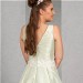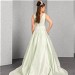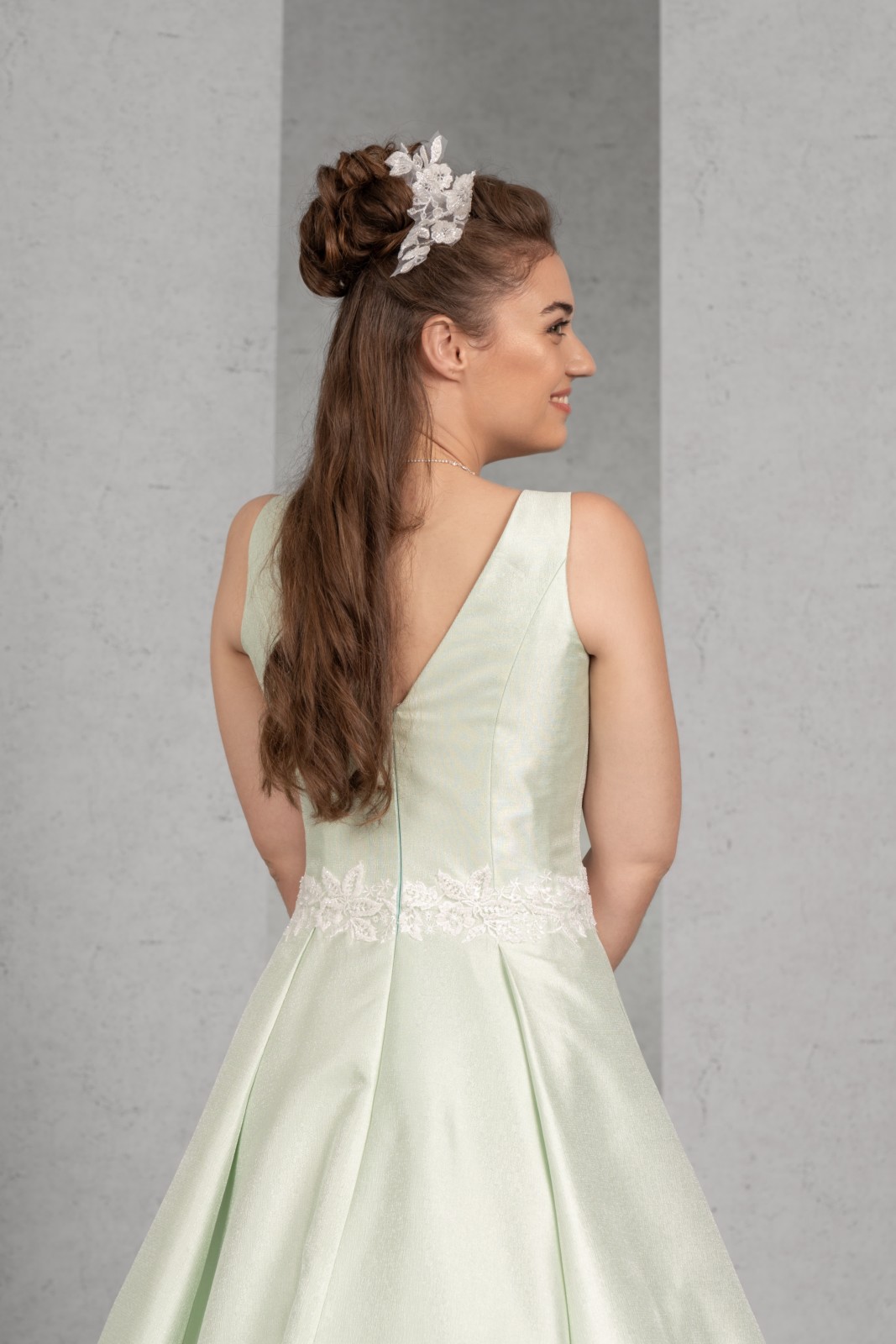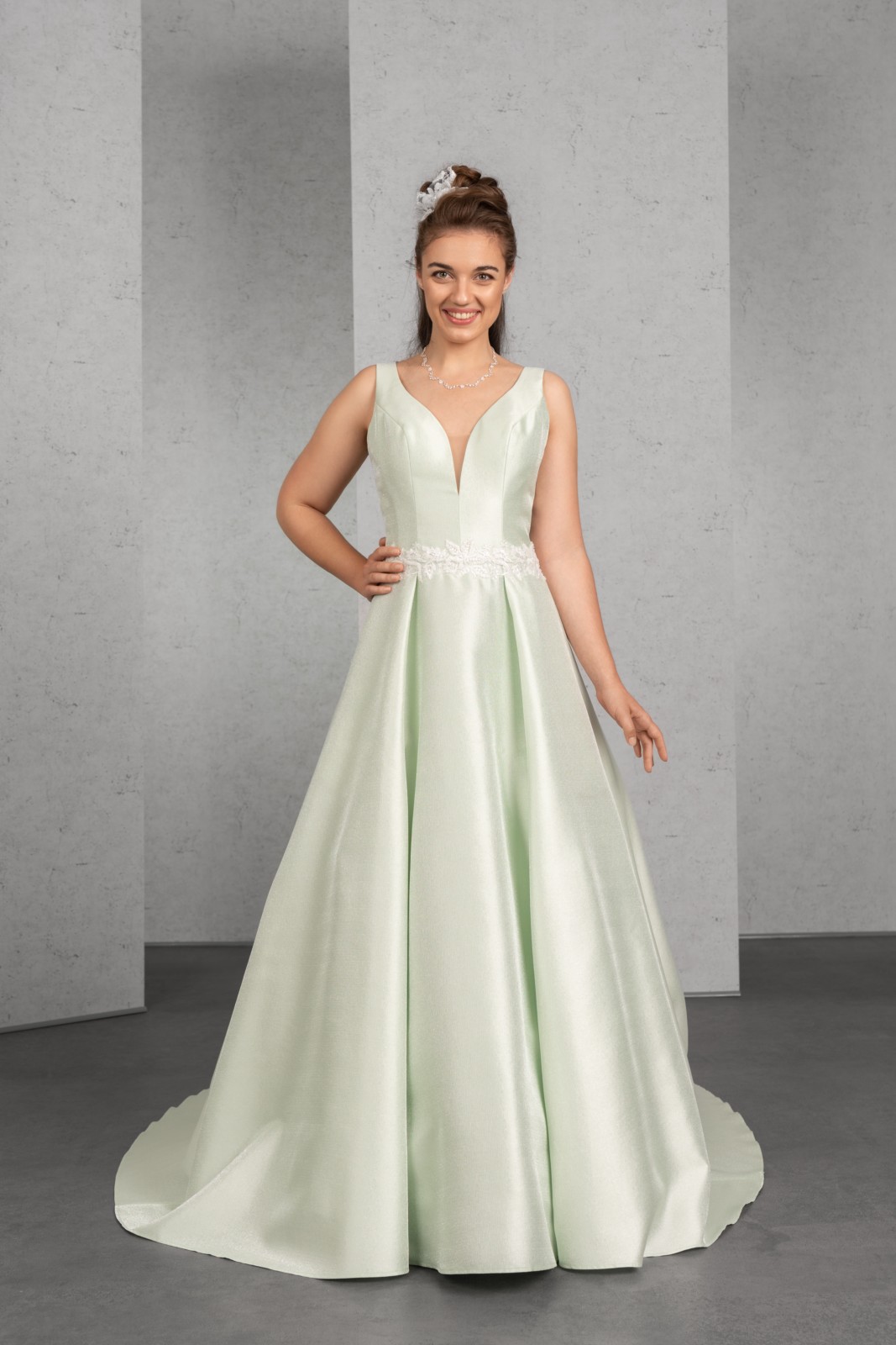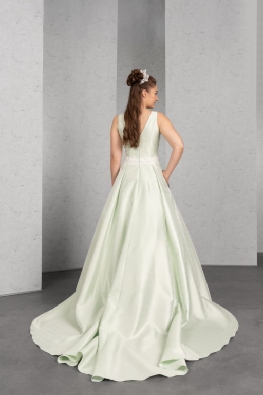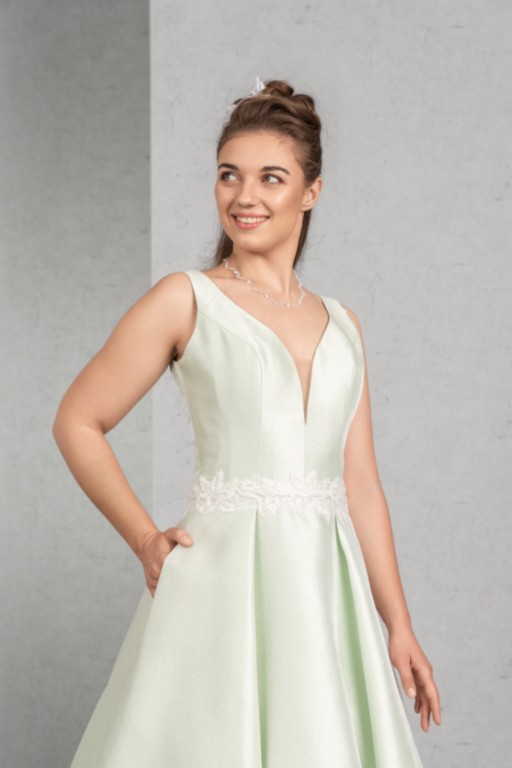 Das Oberteil mit kurzem Cut-Out und normaler Rückenhöhe wird vom weiten Rock mit Kellerfalten und Seitentaschen perfekt ergänzt, eine zarte Perlenborte betont die Taille. Das außergewöhnliche Material in Leinenoptik mit dezentem Glitzer verleiht diesem Brautkleid den besonderen Look.