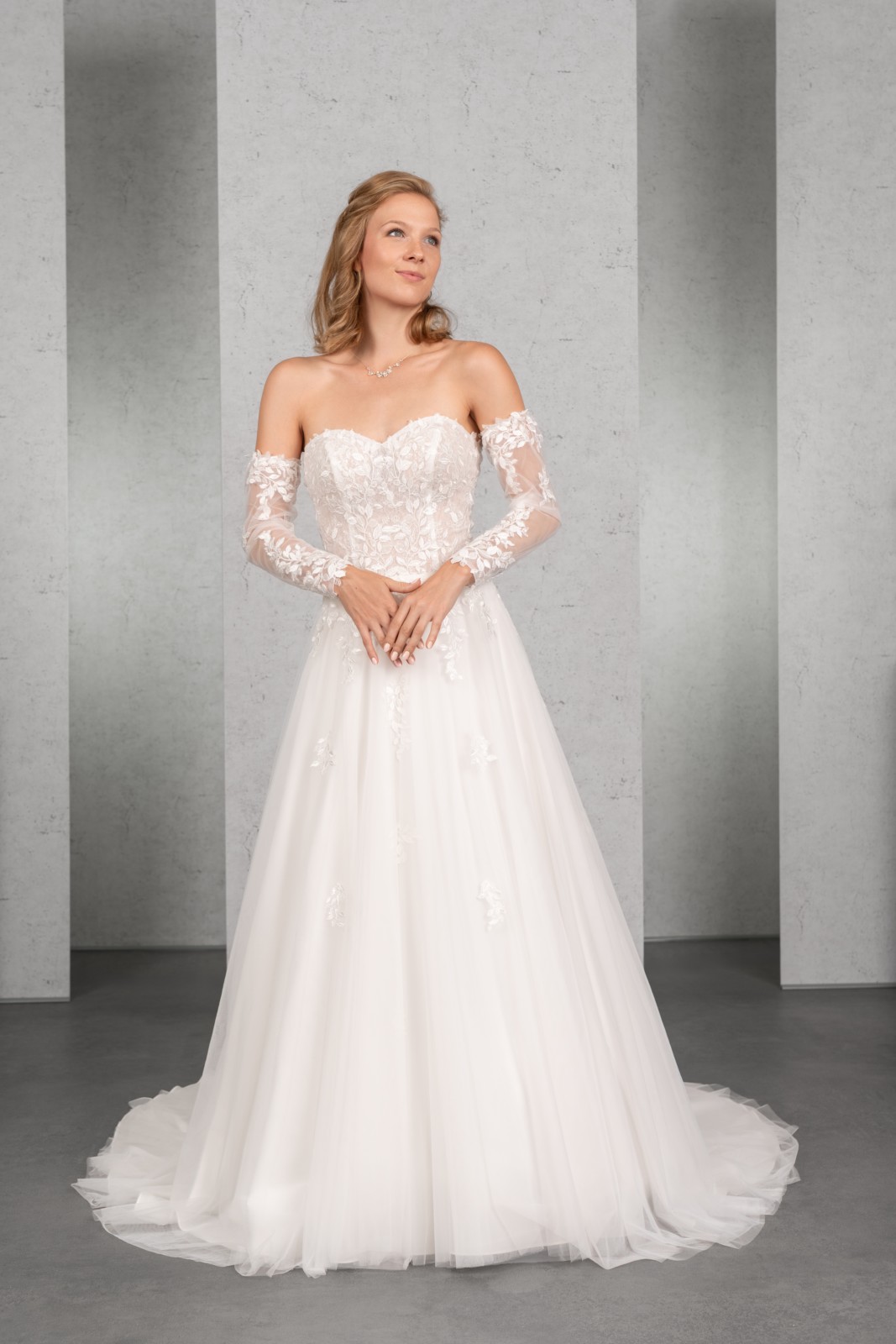 Das transparente Top ist mit Paillettenspitze unterlegt und aufwendig mit blätterförmiger Spitze besetzt, die sich auf der Schleppe des weiten Tüllrocks wiederholt. Die abnehmbaren langen Ärmel vervollständigen das romantische Brautkleid perfekt.