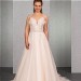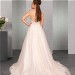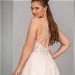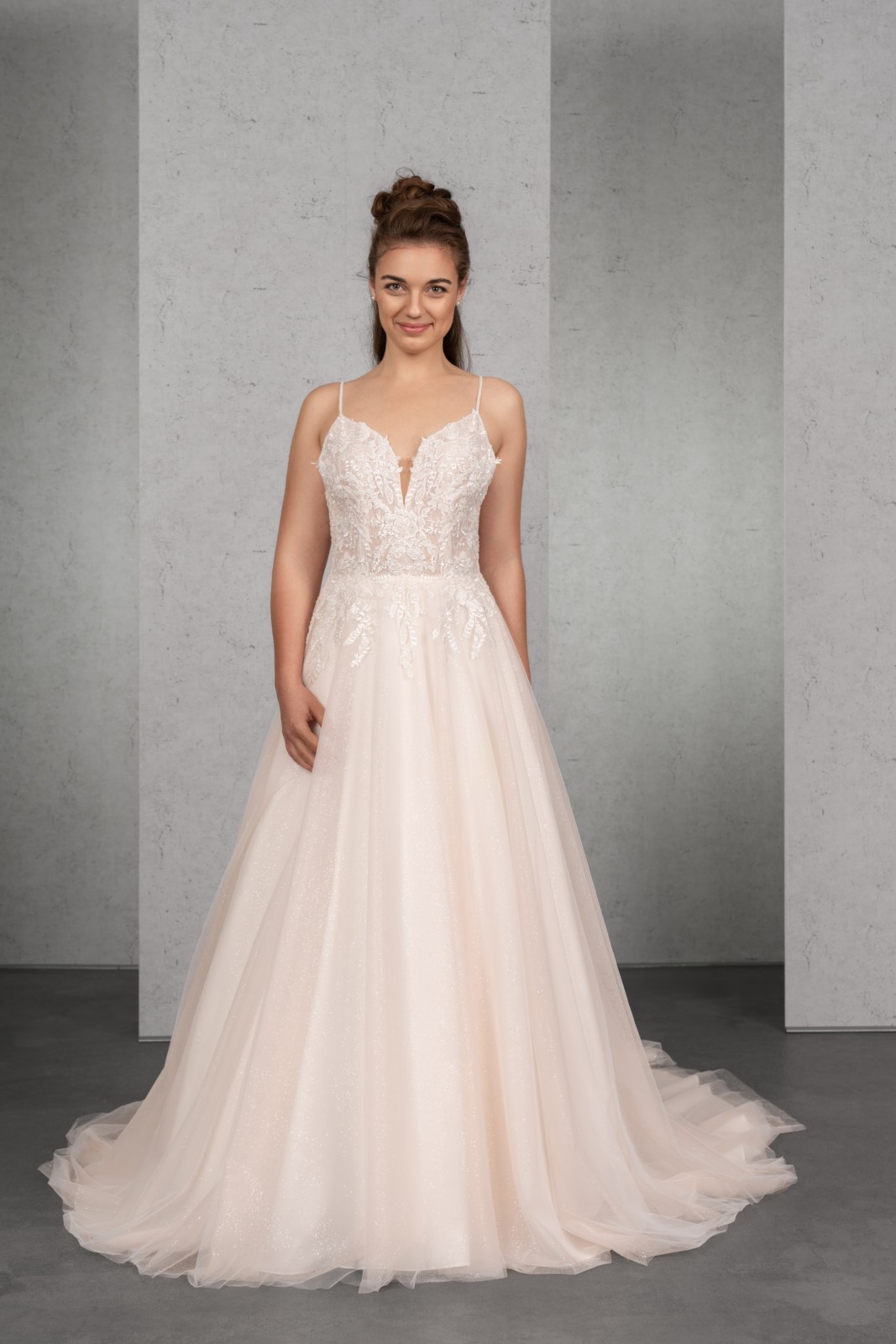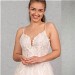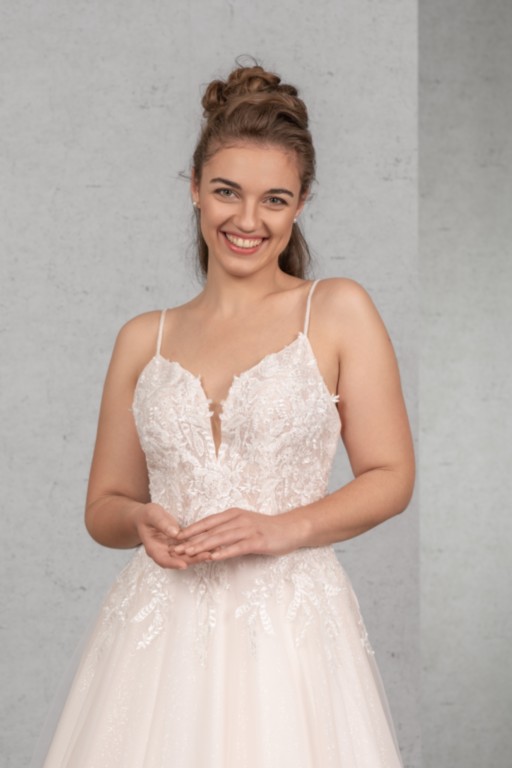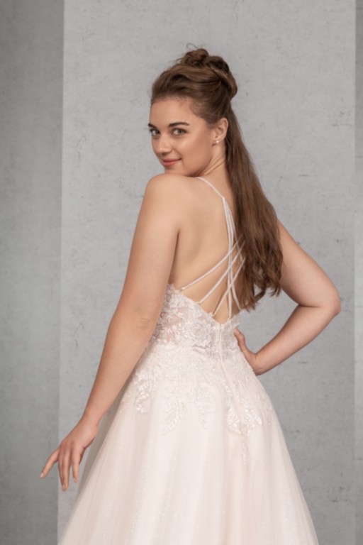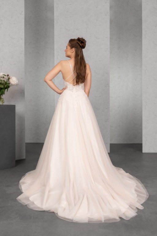 Das transparente und mit Paillettenspitze unterlegte Top mit kurzem Cut-Out ist üppig mit perlenbestickter Spitze besetzt, die bis auf den oberen Rock verläuft. Die Perlenbestickten Träger sind besonders im tiefen Rücken ein echter Eyecatcher. Ergänzt wird das romantische Brautkleid durch einen weiten Tüllrock.