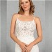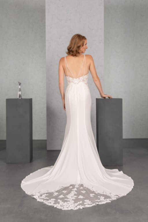 Die Blätter und Blüten der Spitze dominieren das Top mit geradem Ausschnitt und tiefem Rücken, die perlenbestickten Träger unterstreichen die zarte Ausstrahlung. Der schmale Rock aus Crêpe endet in einer umwerfenden Schleppe mit Tülleinsatz und aufwendiger Spitzenapplikation.