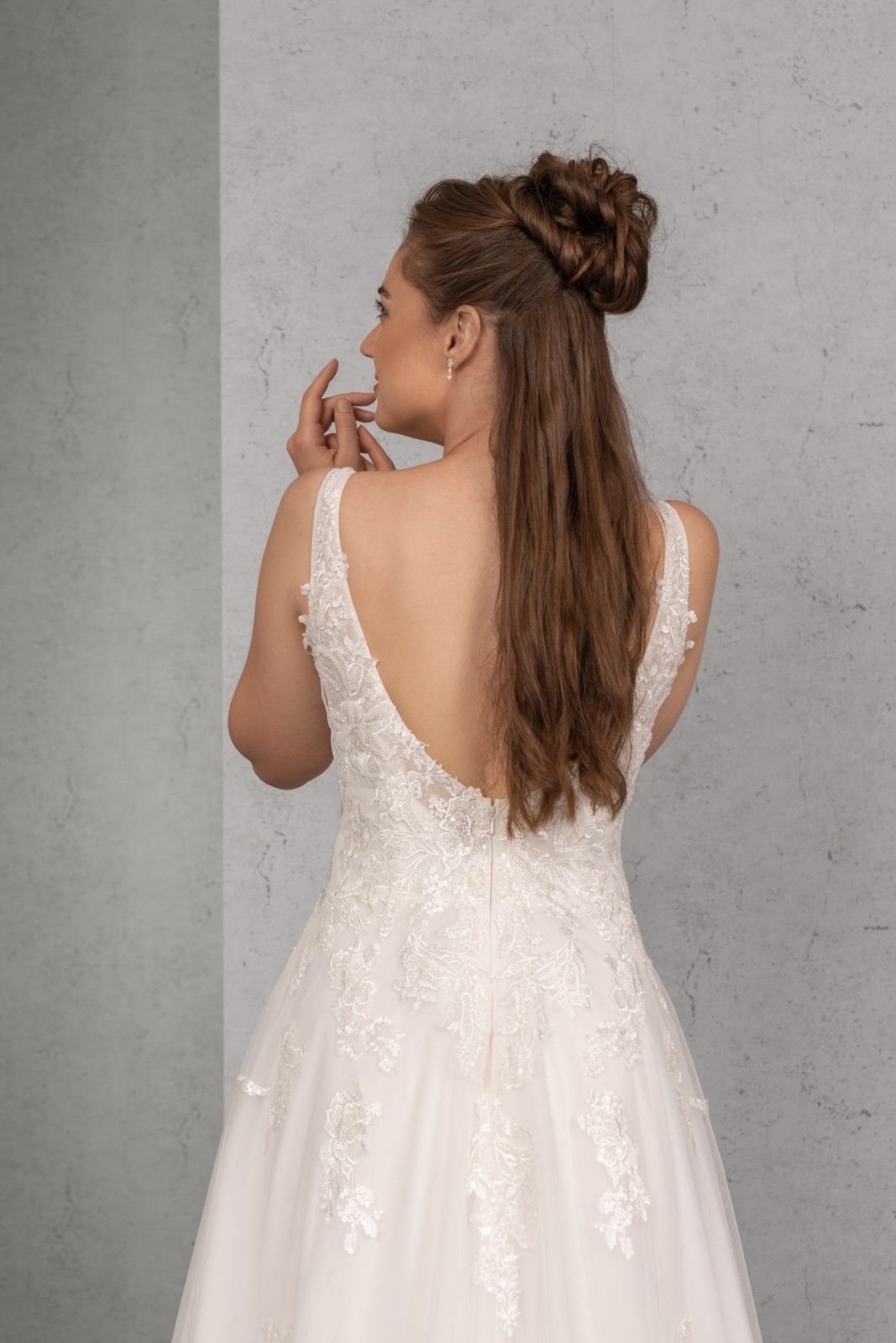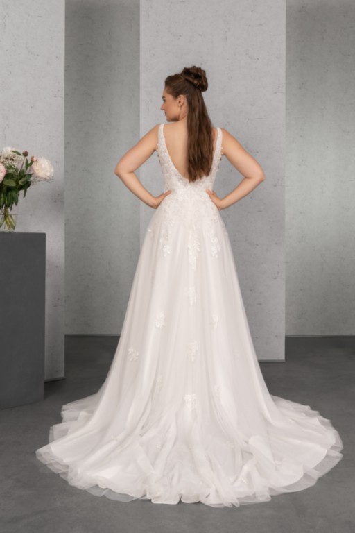Das Modell ist auch mit kürzerem Cut-Out vorne und höherem Rücken, und mit Glitzertüll erhältlich, mit der Artikel-Nummer D-03781.