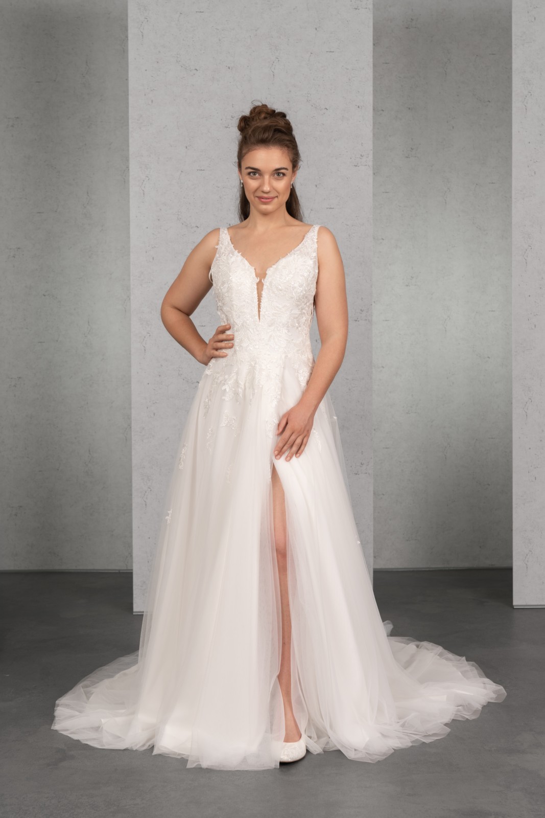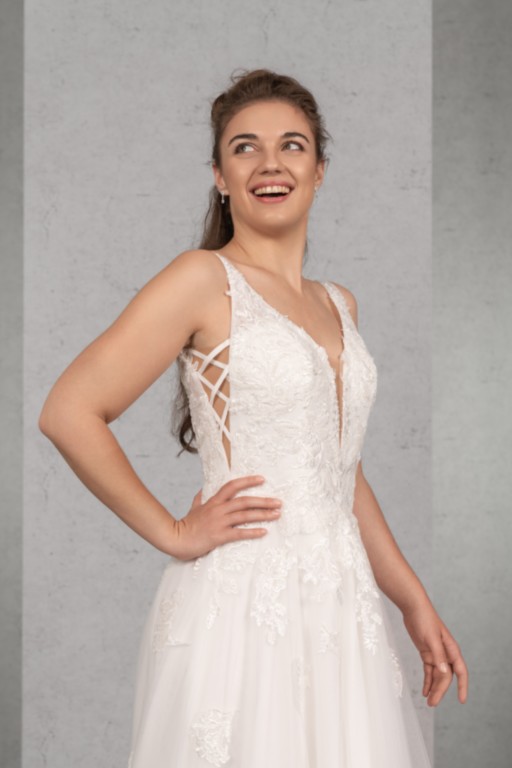 Das aufwendig mit Spitze besetzte Oberteil mit Trägern und tiefem Rücken wird durch die Cut-Out’s vorne und an den Seiten perfekt in Szene gesetzt. Der weite Tüllrock mit Wickelschlitz rundet das Bild harmonisch ab.