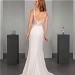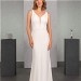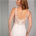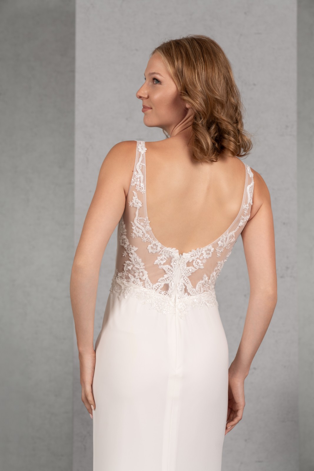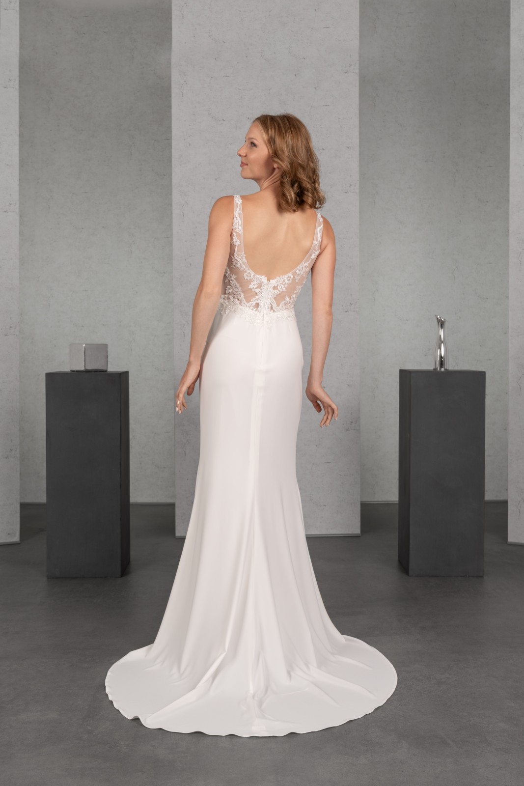 Der taillentiefe Cut-Out und die Perlenborte in der Taille unterstreichen gekonnt die schmale Silhouette des Brautkleides aus mattem Crêpe. Der transparente Rücken mit aufwendiger Perlenapplikation setzt einen umwerfenden Akzent.