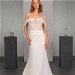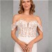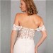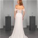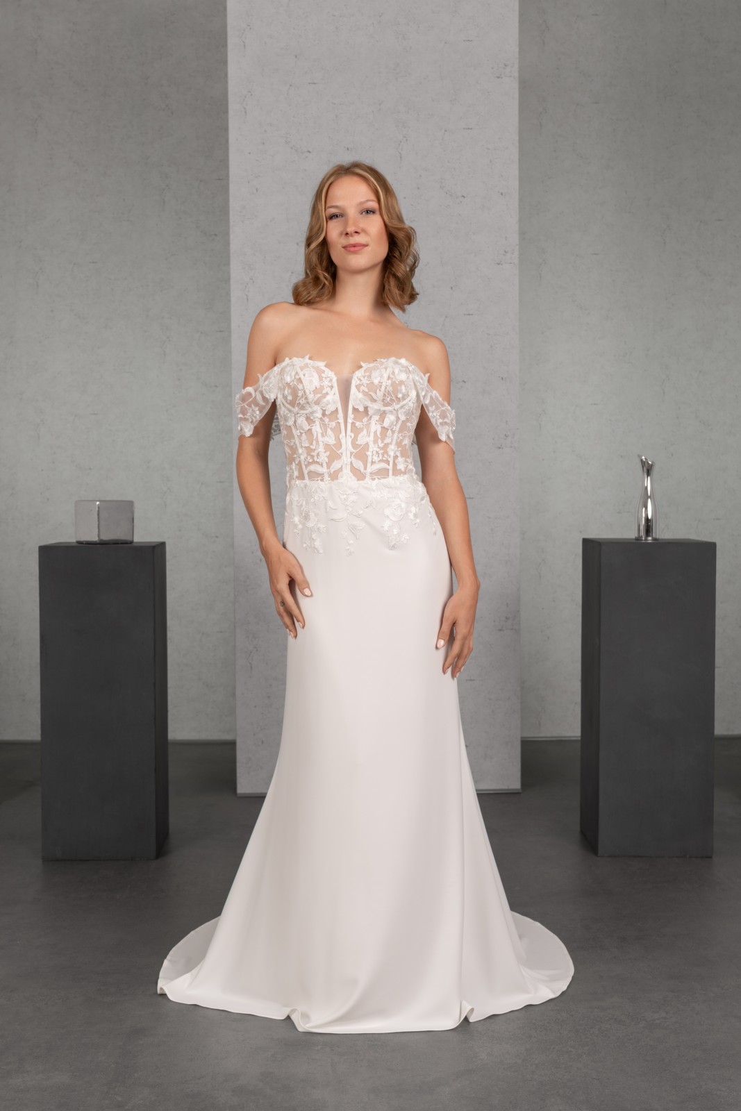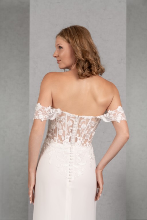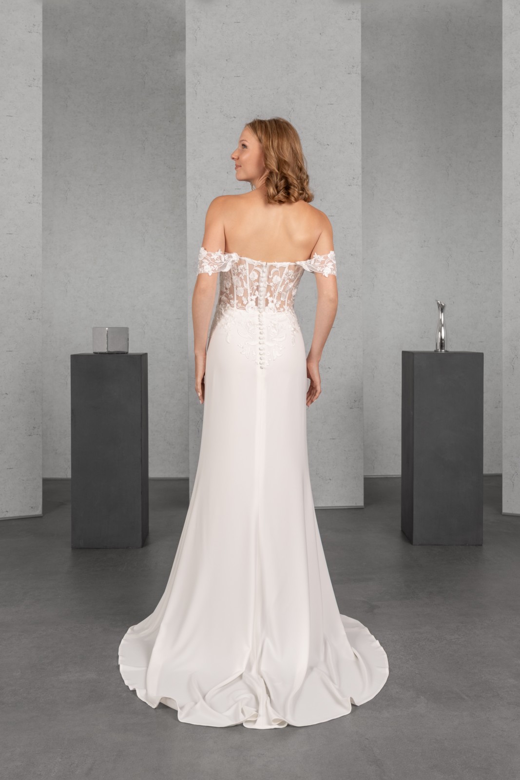 Florale Spitzen zieren das transparente Korsagentop mit sichtbaren Stäbchen und taillentiefem Cut-Out, die sich auf den abnehmbaren Carmen-Trägern wiederholen. Ergänzt wird der sexy Look durch einen schmalen Rock aus Crêpe mit Kurzschleppe.