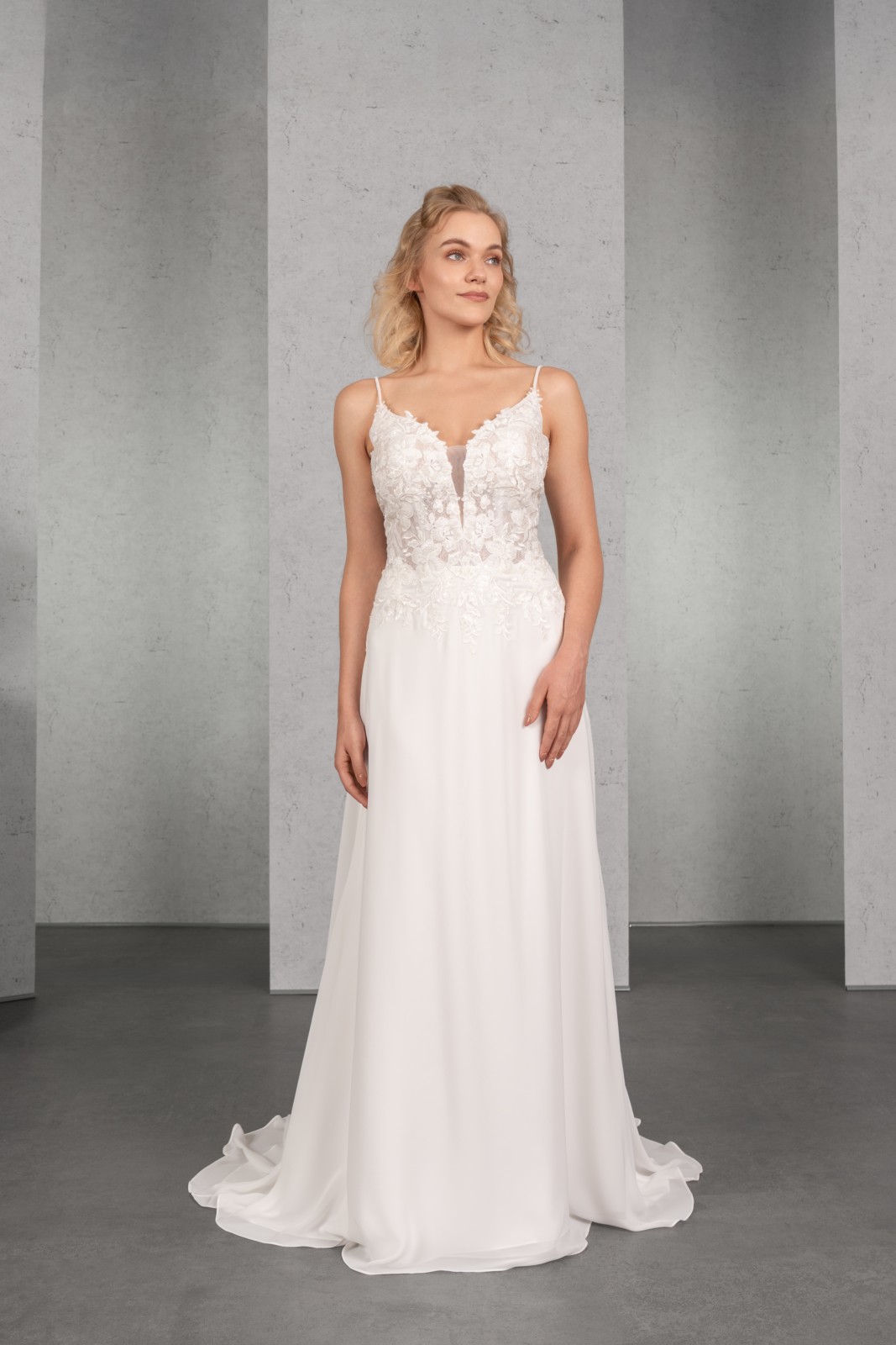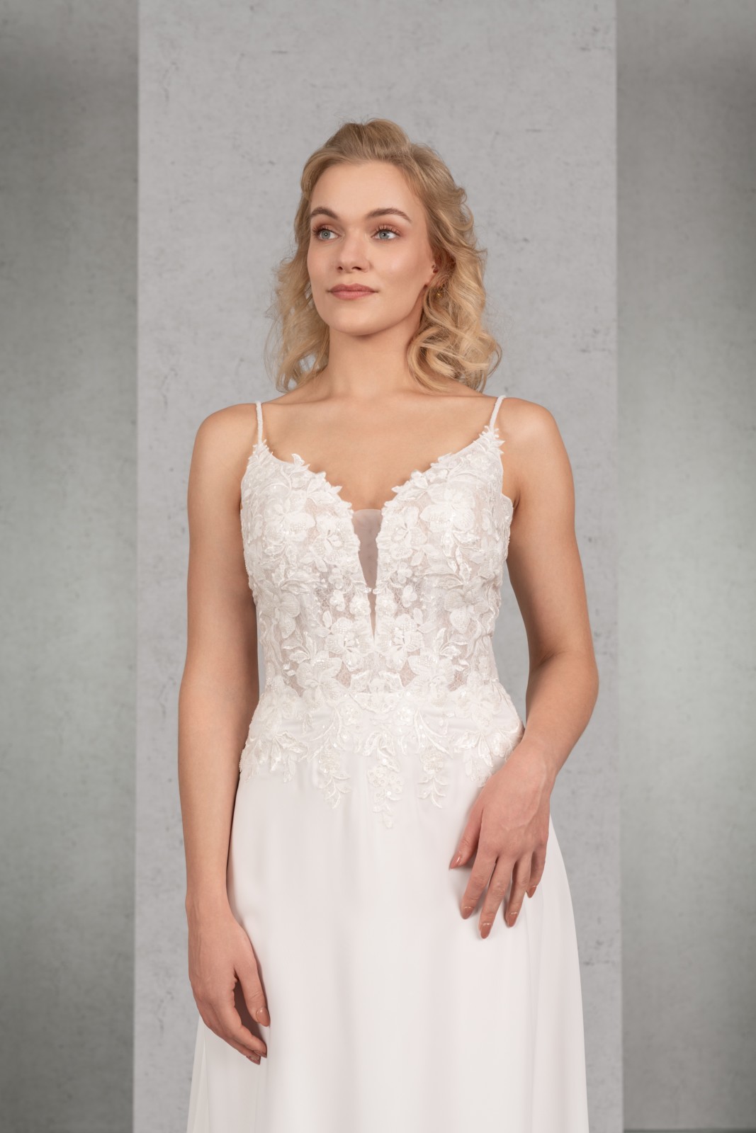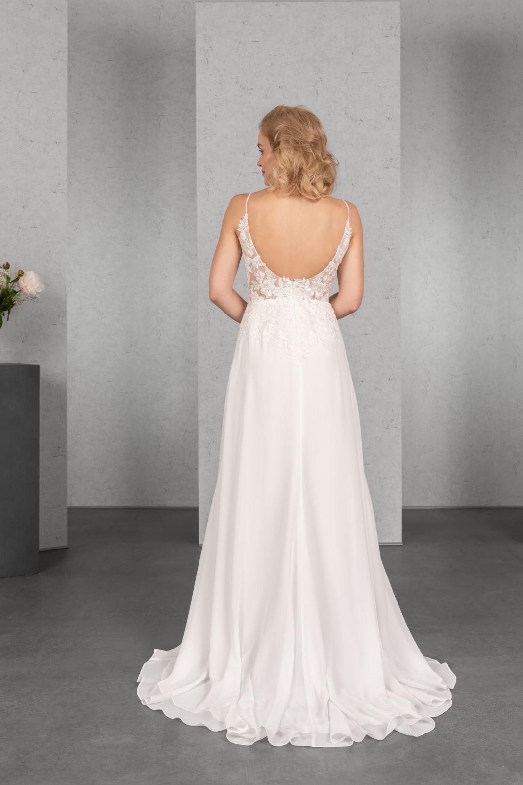 Aufwendig mit Perlen bestickte Spitze betont das transparente Top mit Cut-Out und tiefem Rücken, perlenbestickte schmale Träger unterstreichen die zarte Ausstrahlung. Den perfekten Abschluss bildet der weite Rock aus fließendem Chiffon.