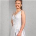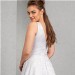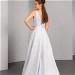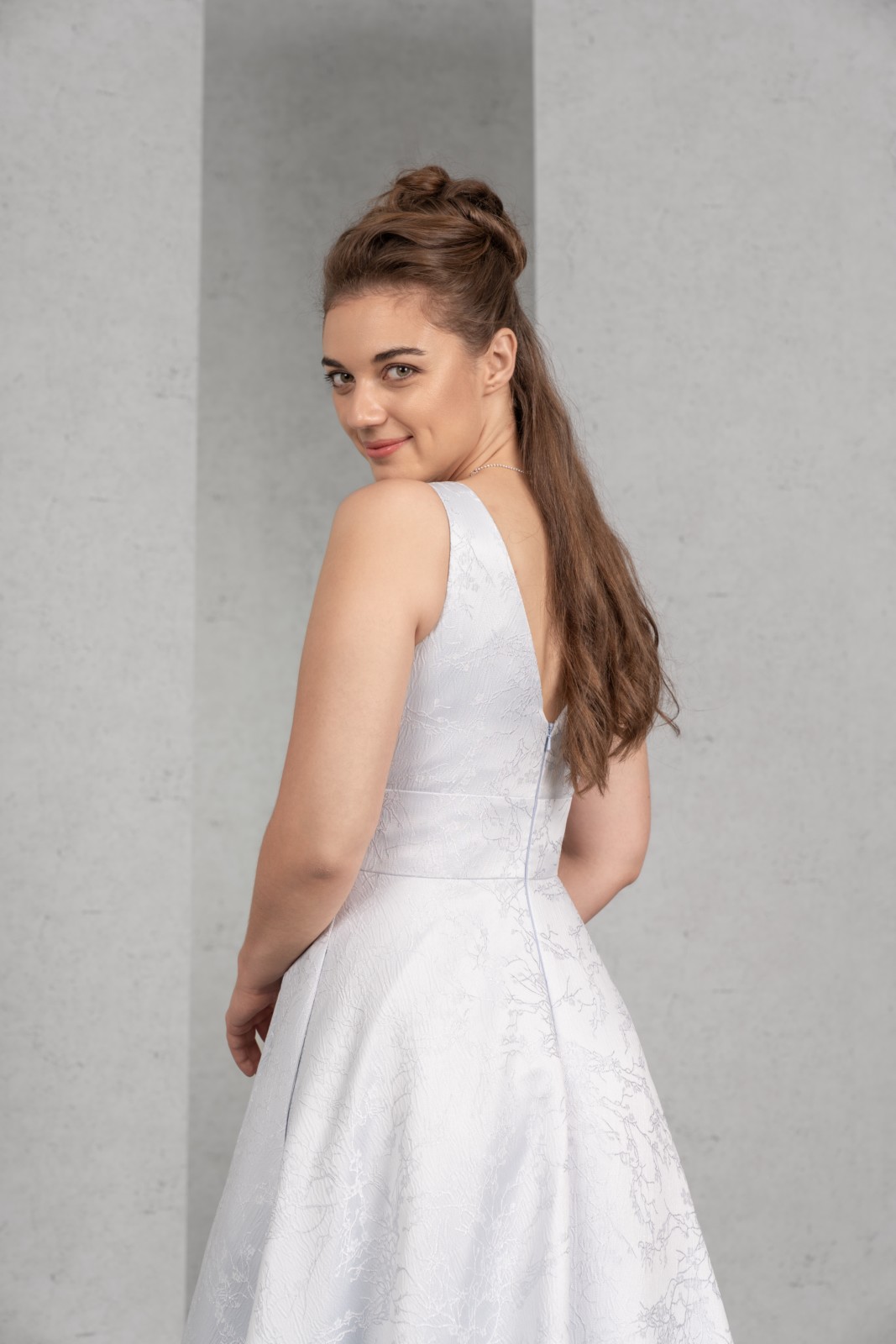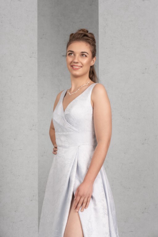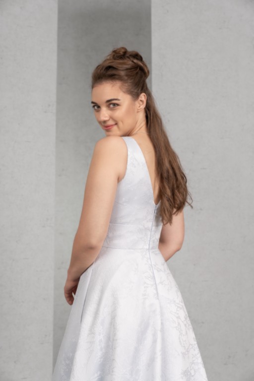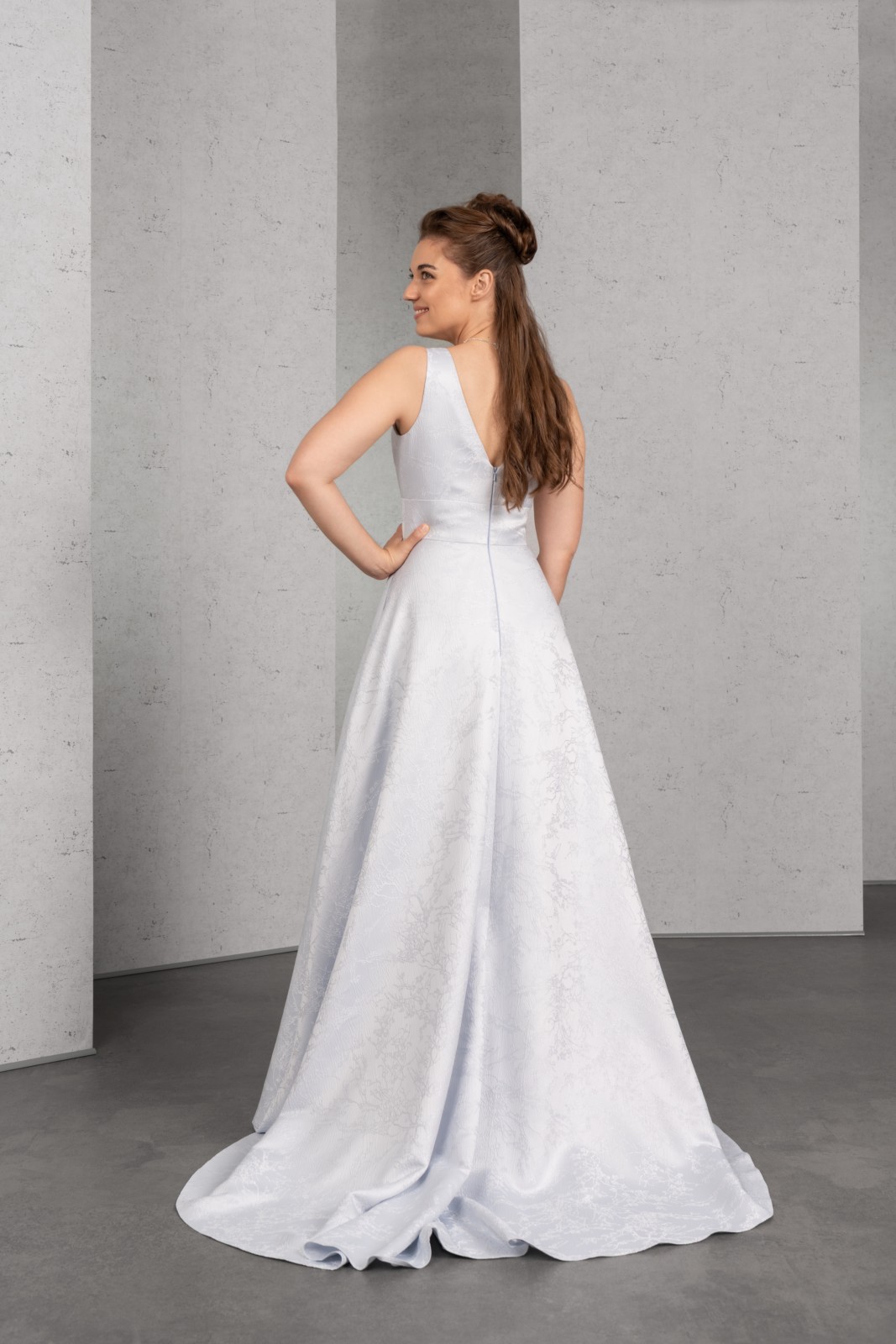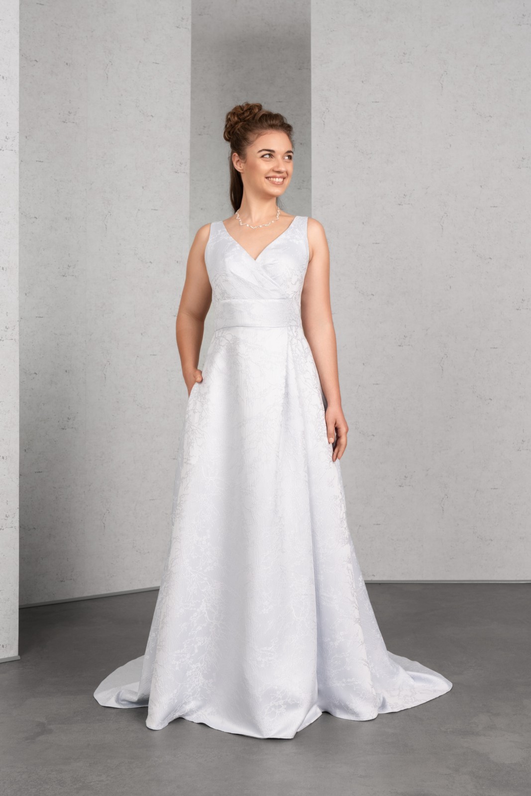 Eine breite Passe in der Taille betont das Top mit breiteren Trägern und normaler Rückenhöhe, der weite Rock mit Wickelschlitz, Seitentaschen und Kurzschleppe setzt das Modell gekonnt in Szene. Ausdrucksstarker Jacquard unterstreicht den figurfreundlichen Schnitt dieses umwerfenden Brautkleides.