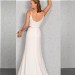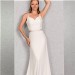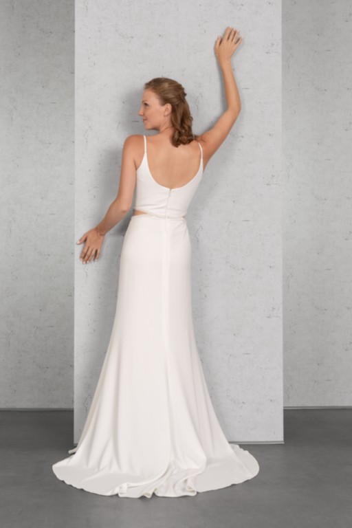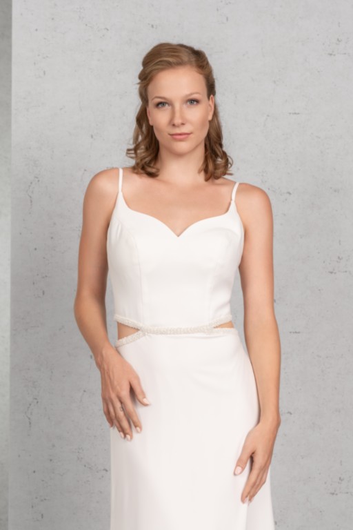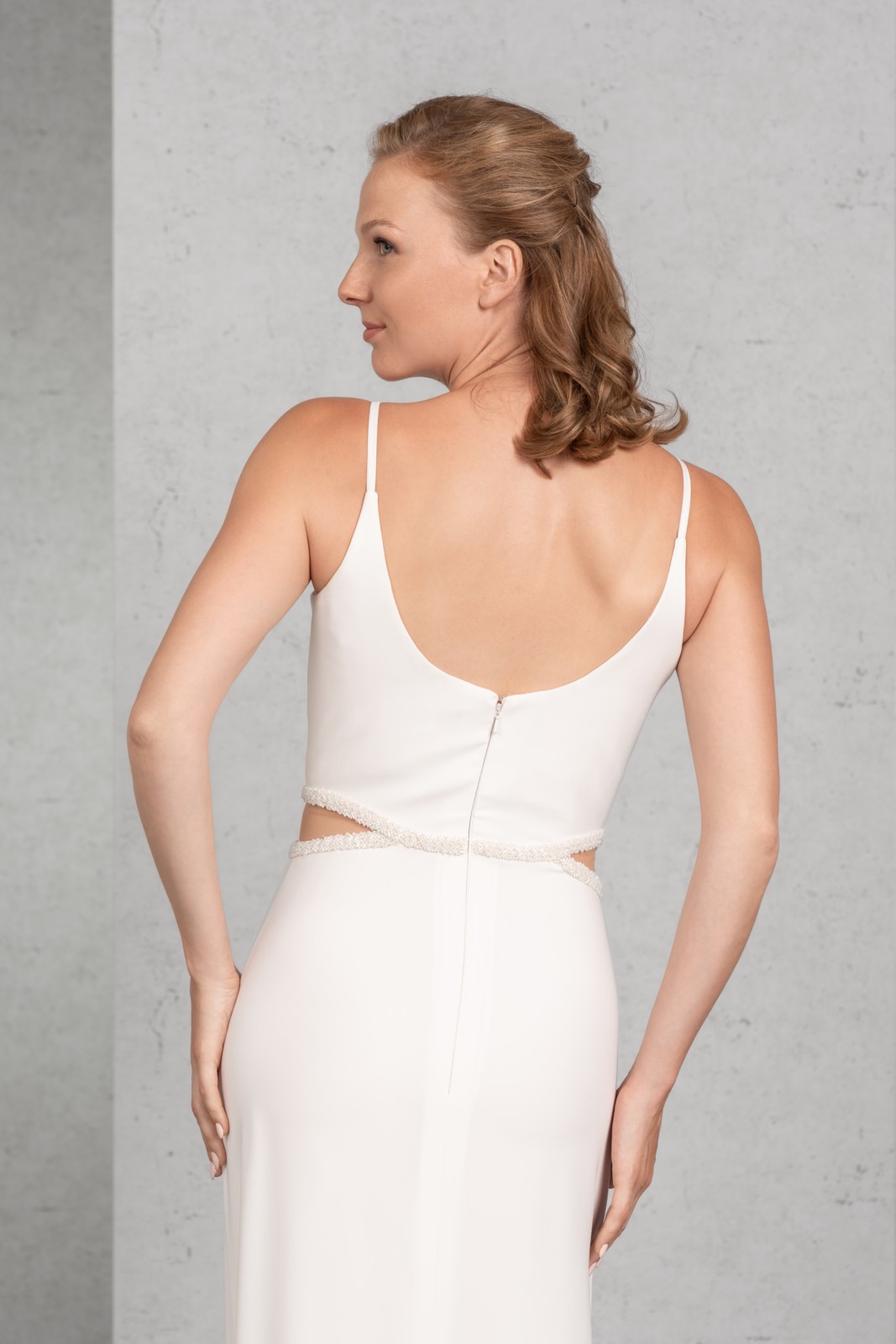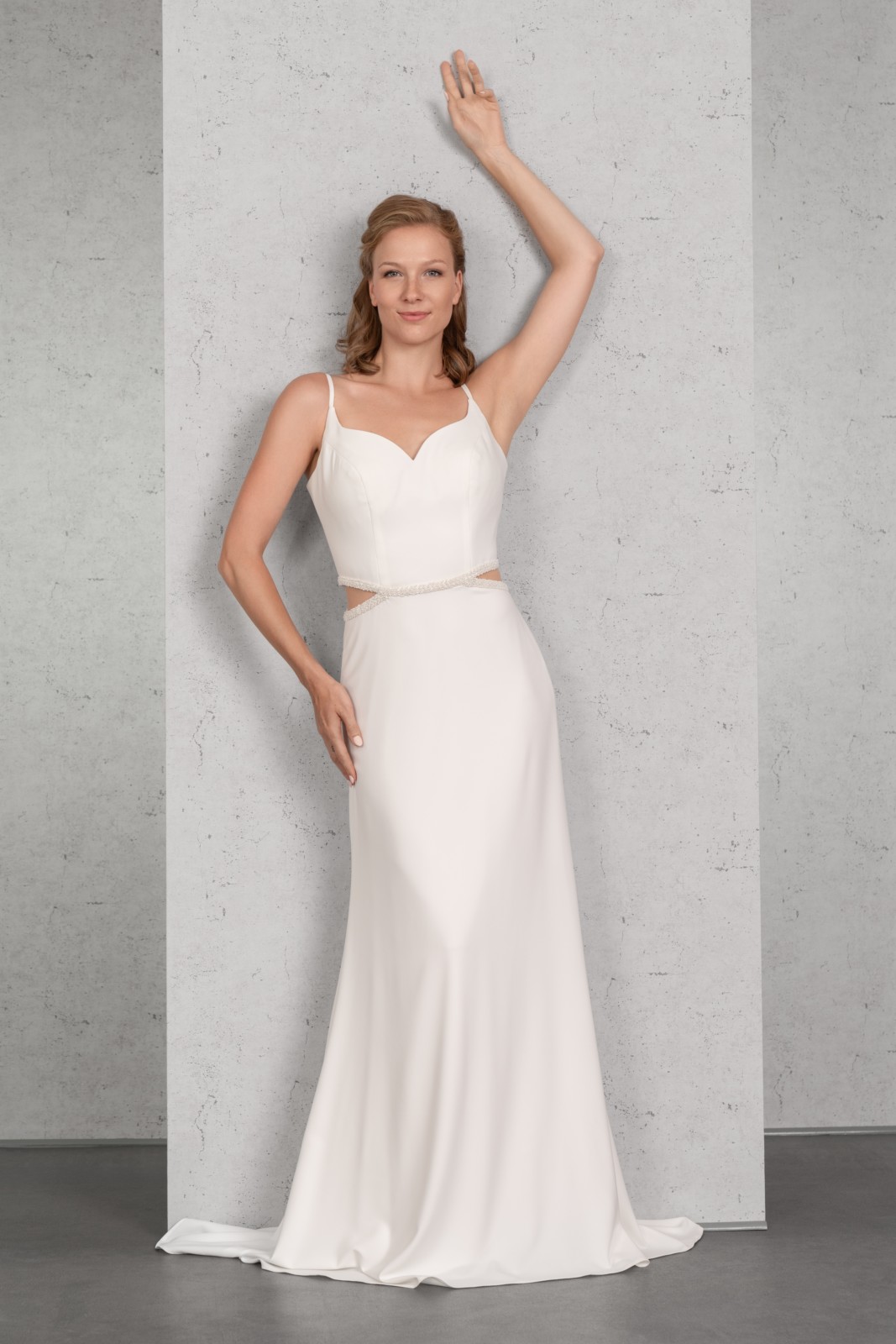 So geht sexy! Das schlichte Kleid in schmaler Silhouette betont die Figur der Braut. Eine Perlenborte umrahmt die seitlichen Cut-Out’s und betont die Taille des edlen Brautkleides aus weichem Crêpe.