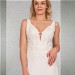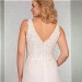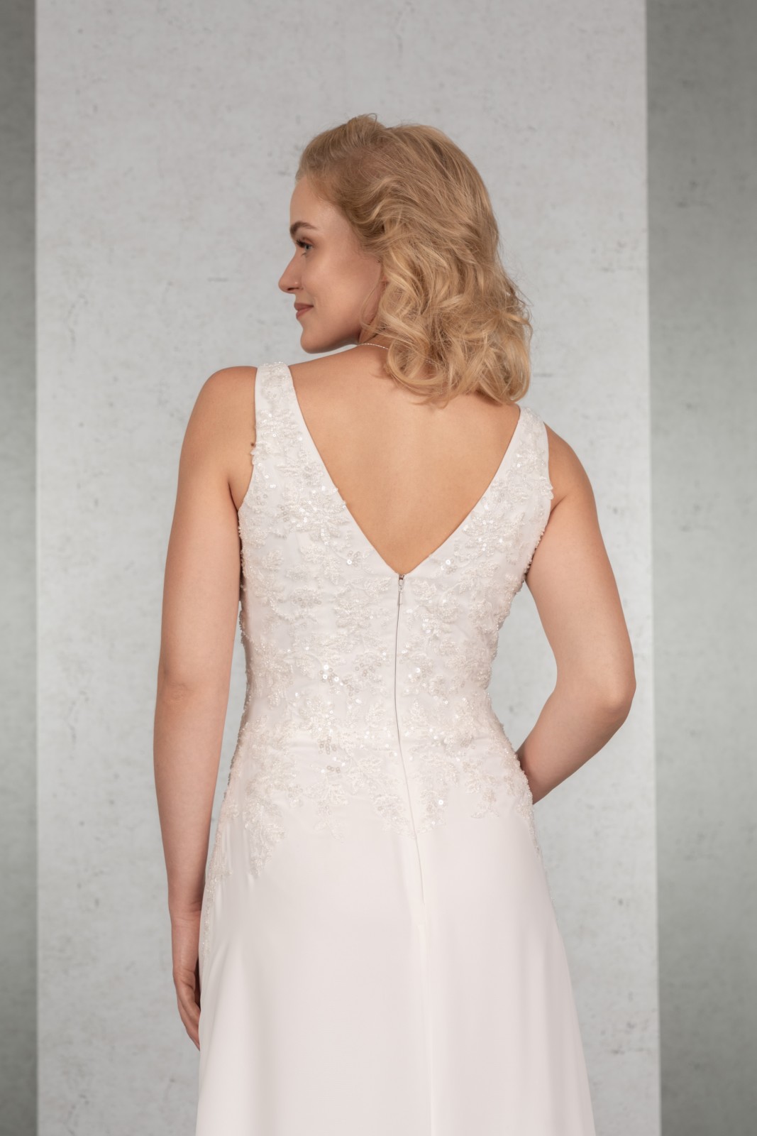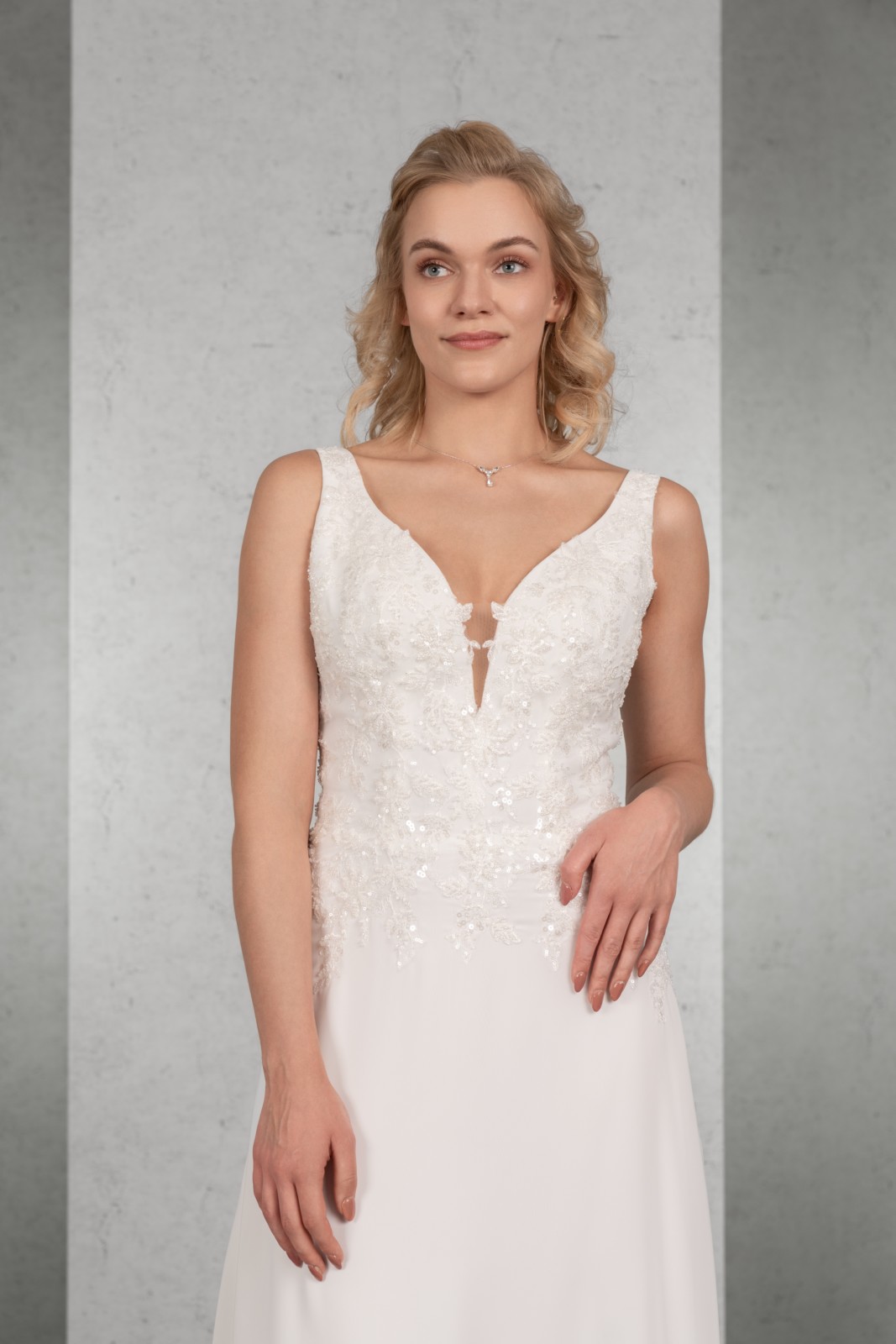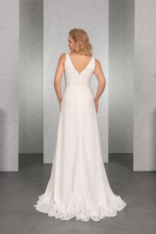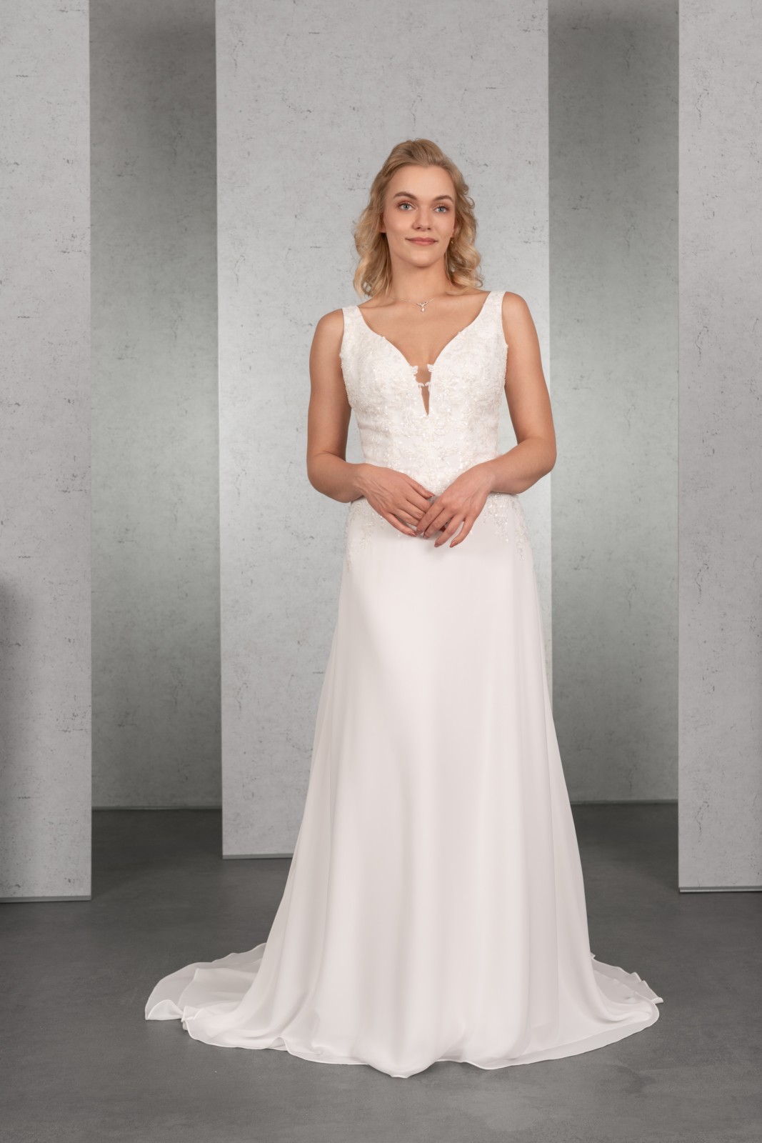 Das Oberteil mit kurzem Cut-Out, breiteren Trägern und BH-freundlicher Rückenhöhe ist mit floraler Spitze besetzt, die bis auf den oberen Rock reicht. Ergänzt wird das figurfreundliche Brautkleid durch einen weiten Rock aus fließendem Chiffon.