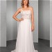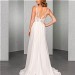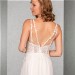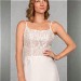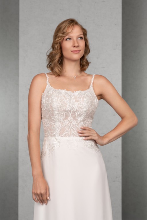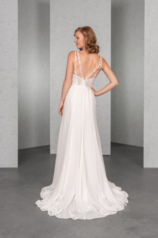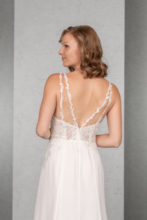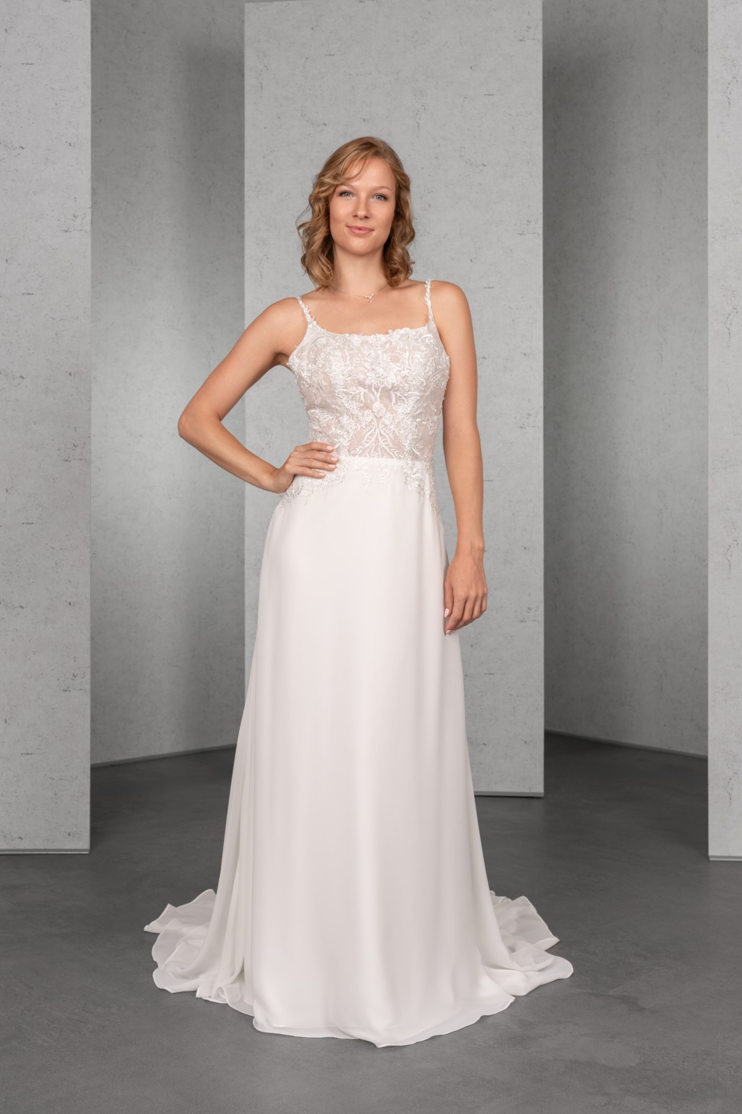 Zarte Spitzenornamente zieren das transparente Oberteil mit geradem Ausschnitt und setzen sich auf den schmalen Trägern und dem oberen Rock fort, die doppelten Träger im tiefen Rücken bilden einen weiteren Blickfang. Vervollständigt wird das modische Brautkleid durch einen weiten Chiffonrock mit Kurzschleppe.