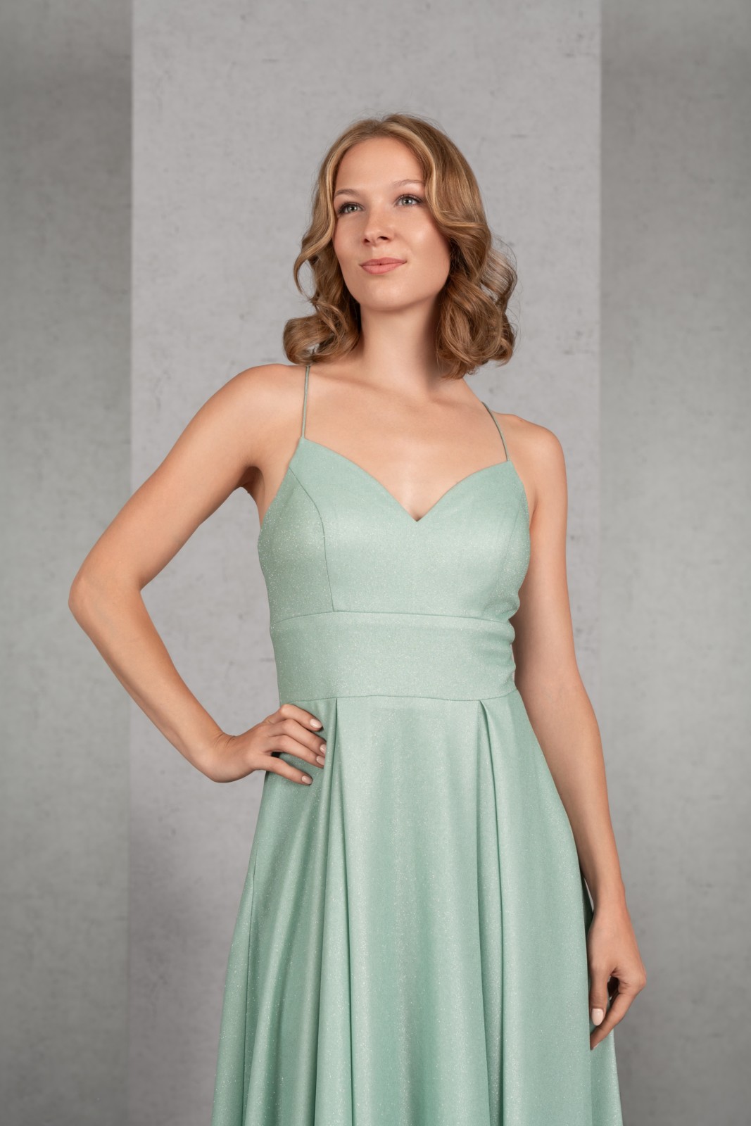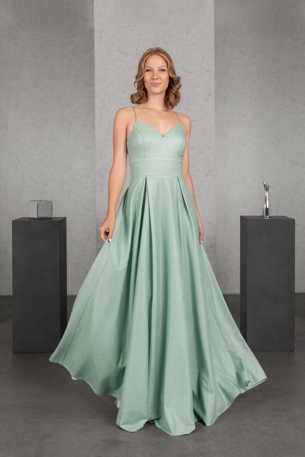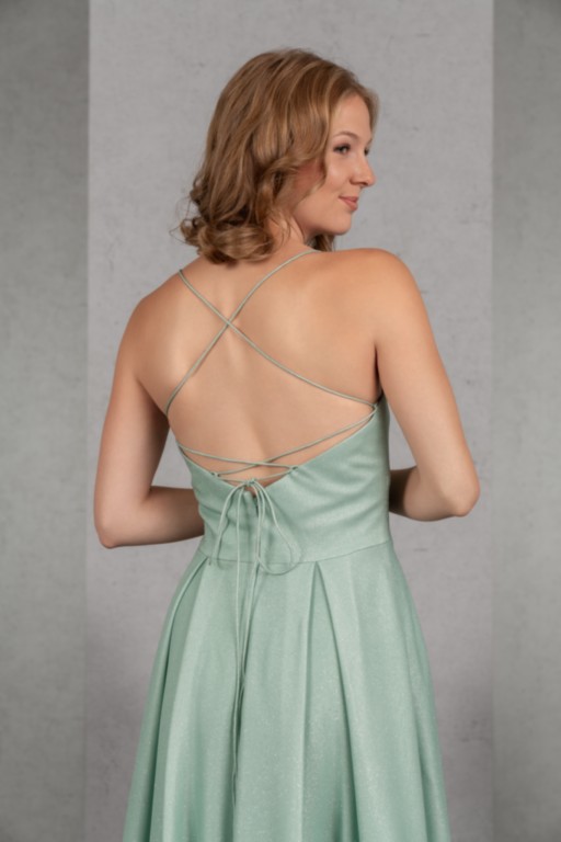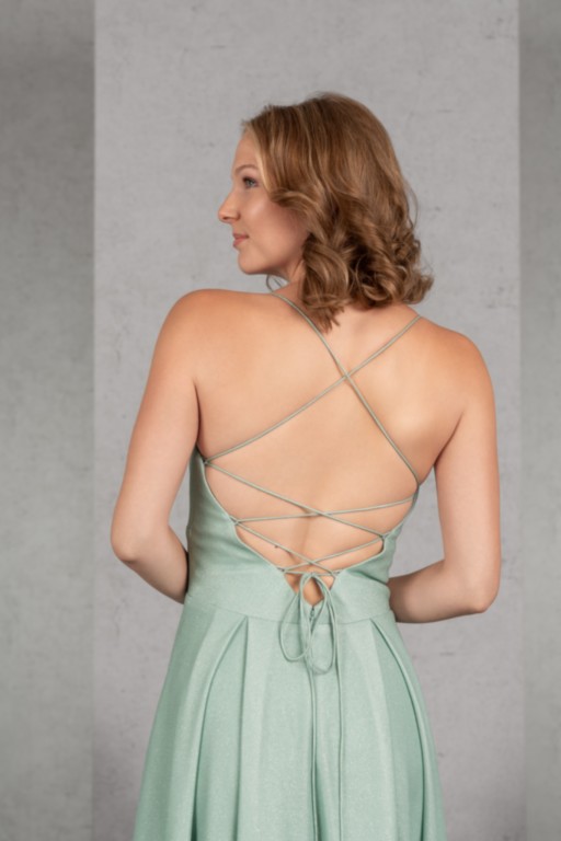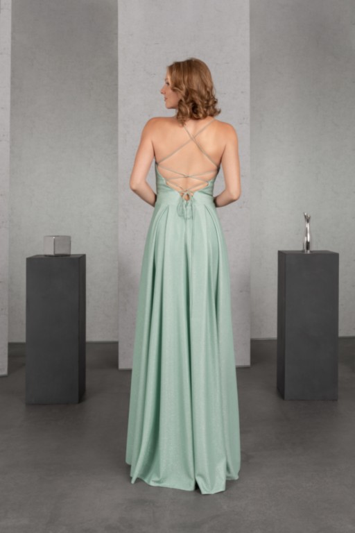 Der ausdrucksstarke Glitzerjersey sorgt für das gewisse Extra des schlichten Abendkleides in der Farbe Salbei. Die schmalen Träger des Tops mit Herzchenausschnitt werden im Rücken geschnürt. Ein besonderer Clou sind die Seitentaschen im weiten Rock mit tiefen Kellerfalten.