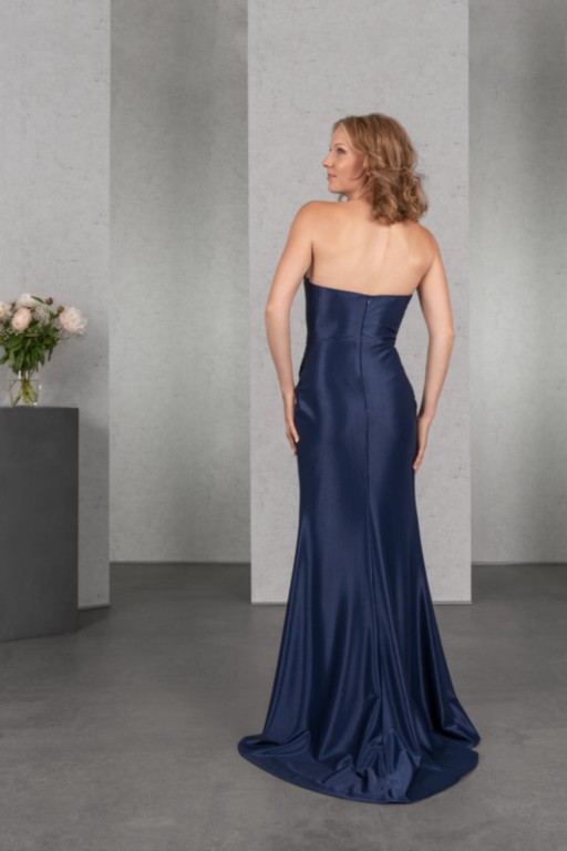 Raffinierte Drapierungen setzen das schmale Kleid mit geradem Ausschnitt aus matt glänzendem Jersey in der Farbe Nachtblau gekonnt in Szene. Der hohe Schlitz sorgt für Bewegungsfreiheit und das gewisse Etwas.