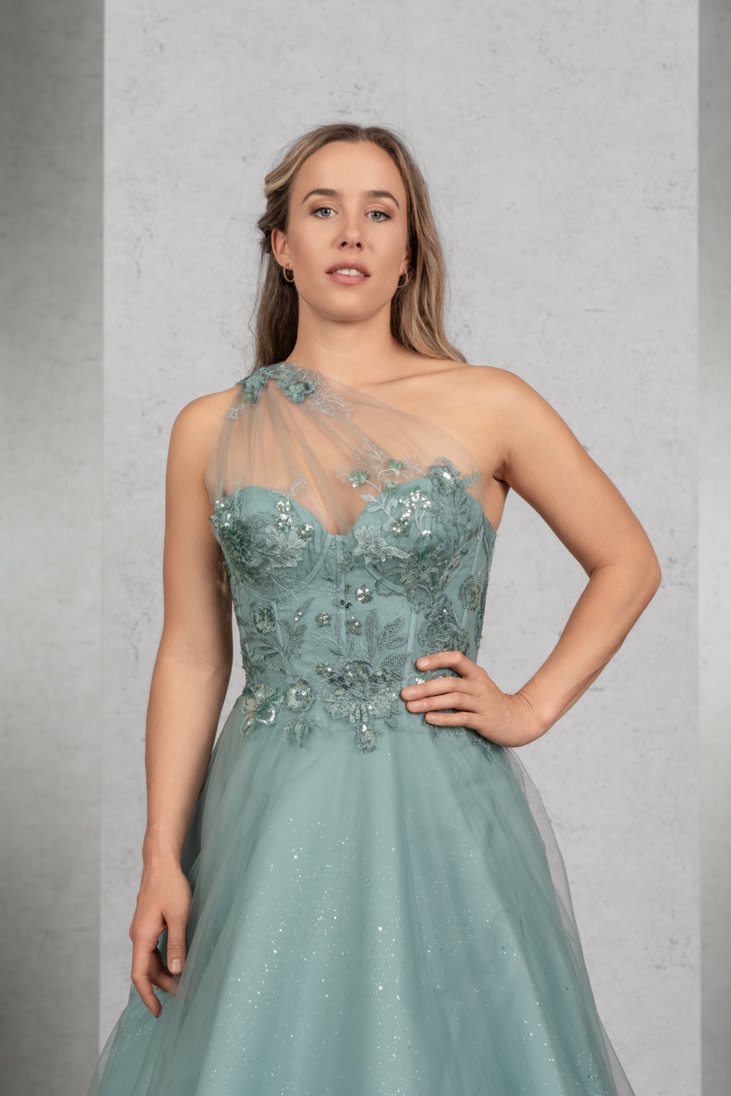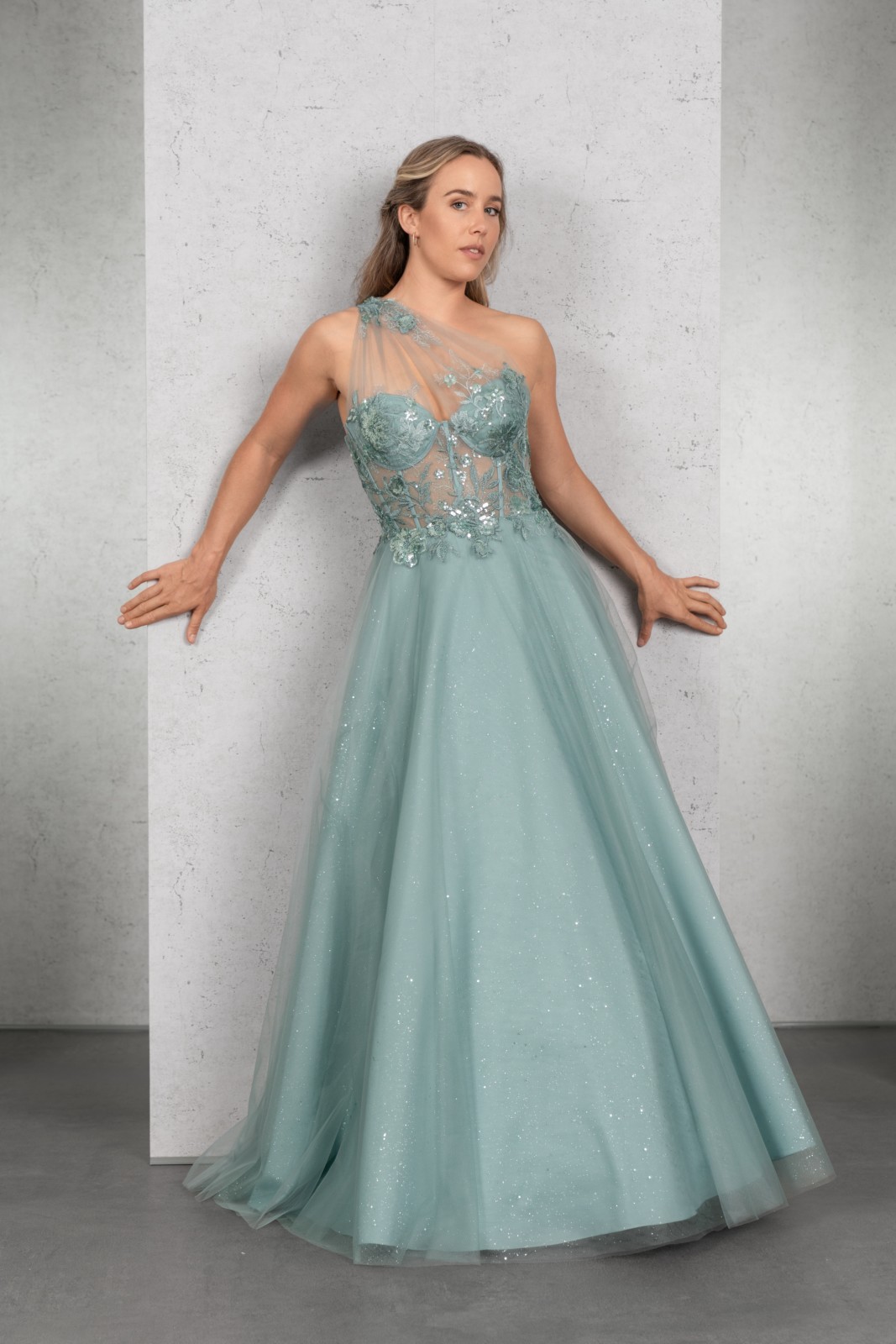 DAS Wahnsinnskleid in der Farbe Salbei für DEN Auftritt: Üppige Pailletten-Applikationen betonen das Top mit sichtbaren Stäbchen und einer raffinierten One-Shoulder Drapierung, die sich im Rücken fortsetzt. Der Rock aus Glitzertüll vervollständigt den extravaganten Look.