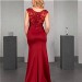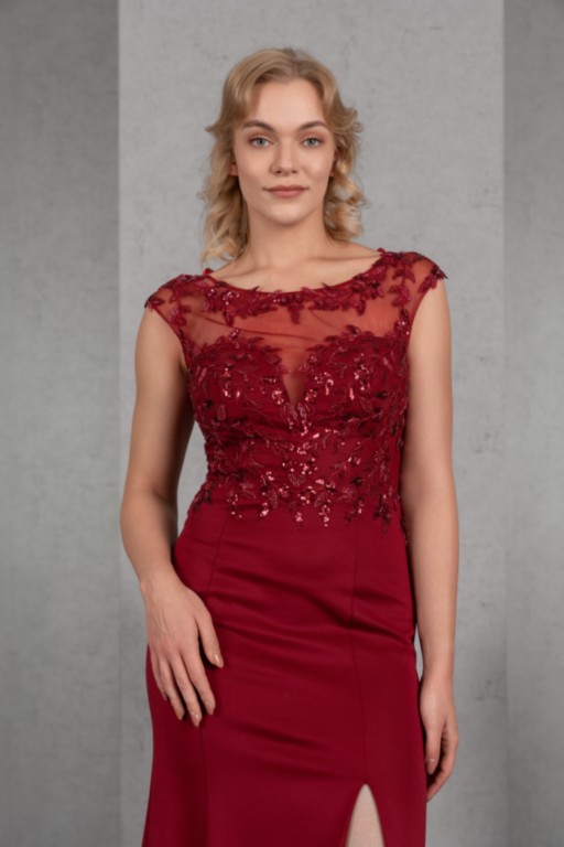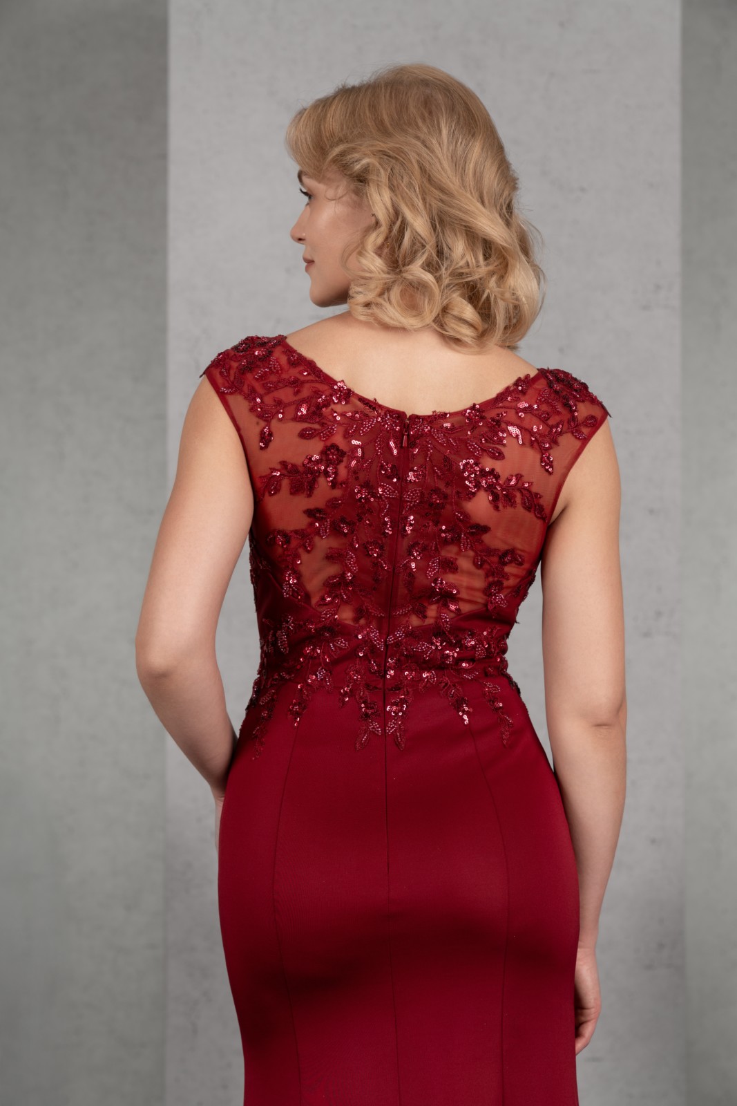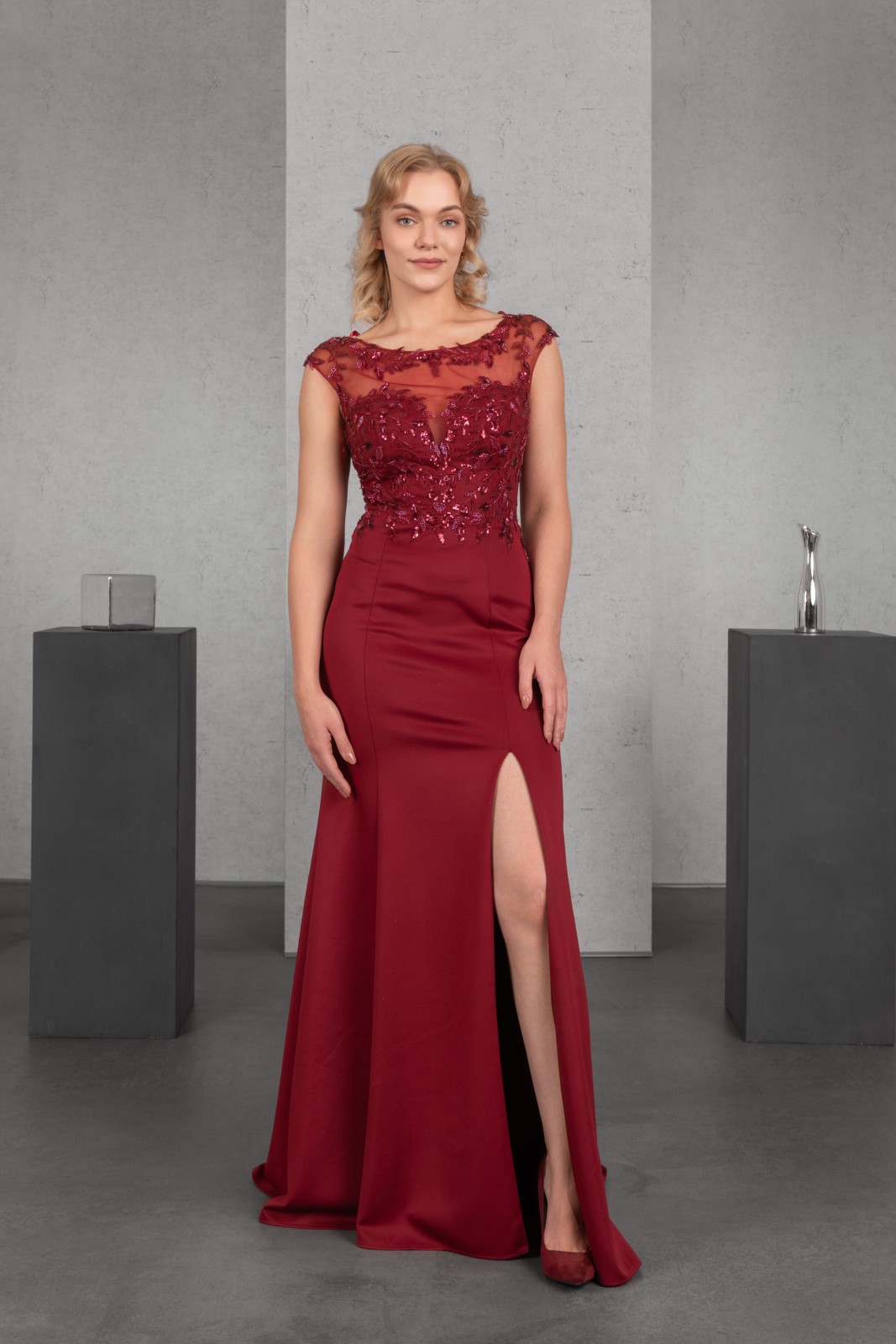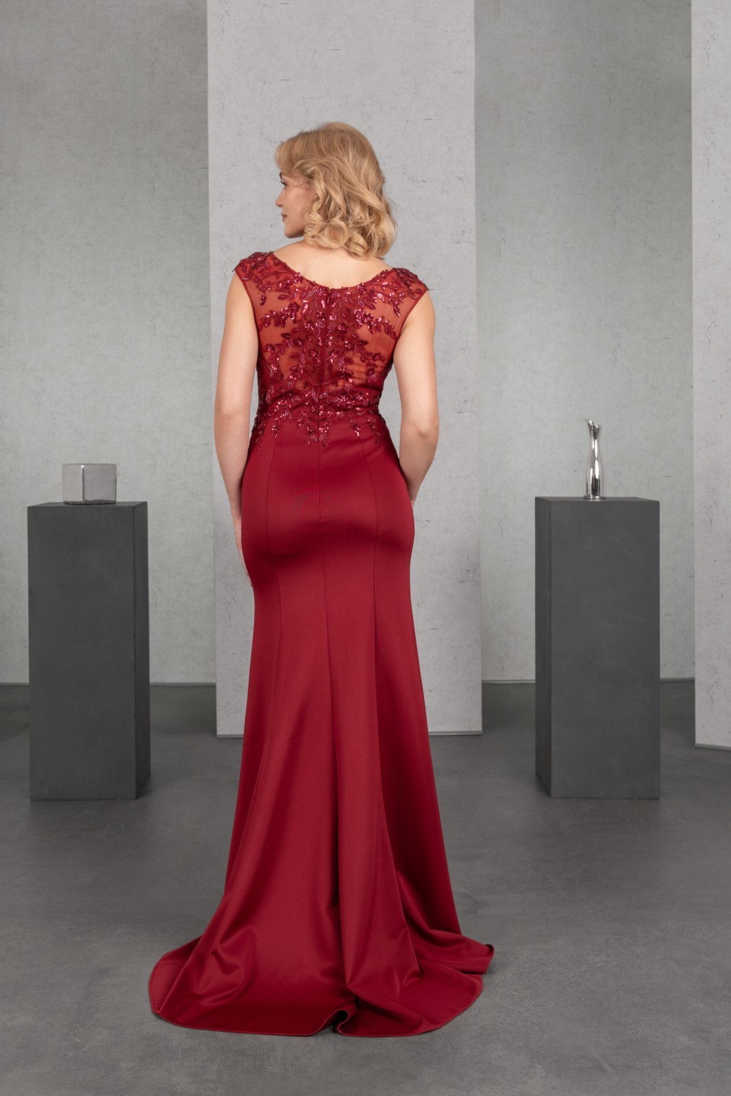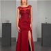 Das aufwendig mit erlesener Perlenapplikation besetzte Oberteil mit überschnittener Schulter und hohem Rücken strahlt pure Eleganz aus. Der schmale Rock mit Schlitz und Kurzschleppe aus Mattem Jersey rundet den zeitlosen Look gekonnt ab.