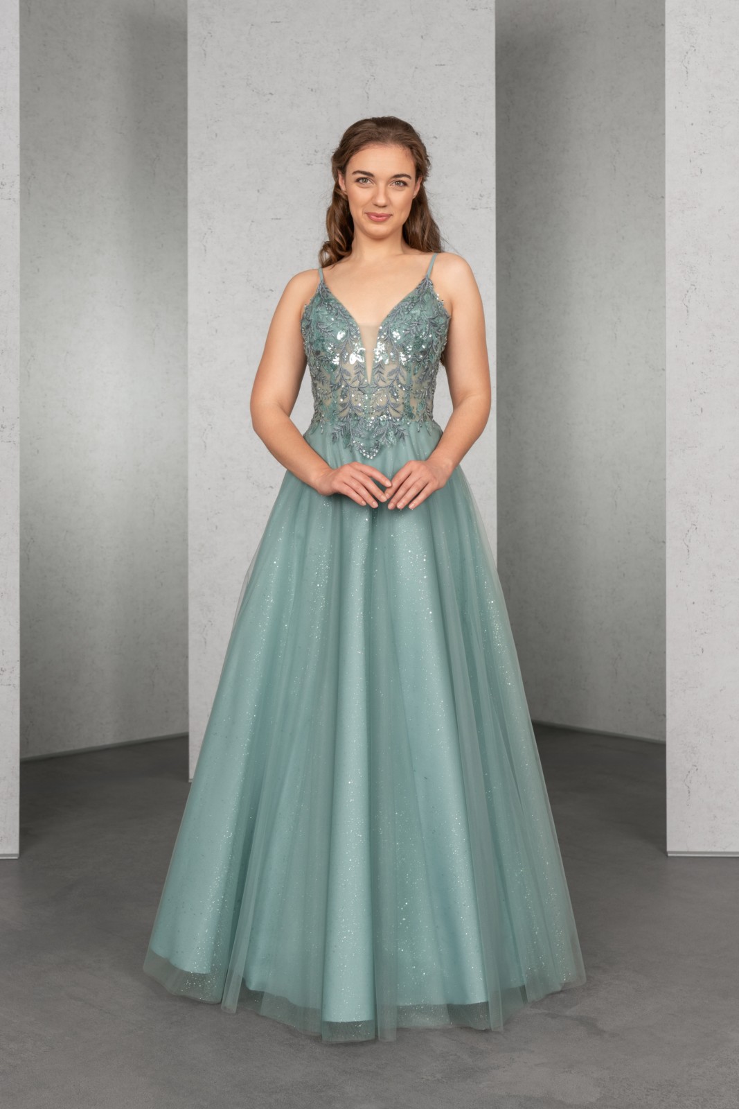 So geht Glitzer. Aufwendige Spitzenapplikationen betonen das transparente Oberteil mit sichtbaren Stäbchen, tiefem Cut-Out und schmalen Trägern. Für den extravaganten Touch sorgt der weite Rock aus Glitzertüll.