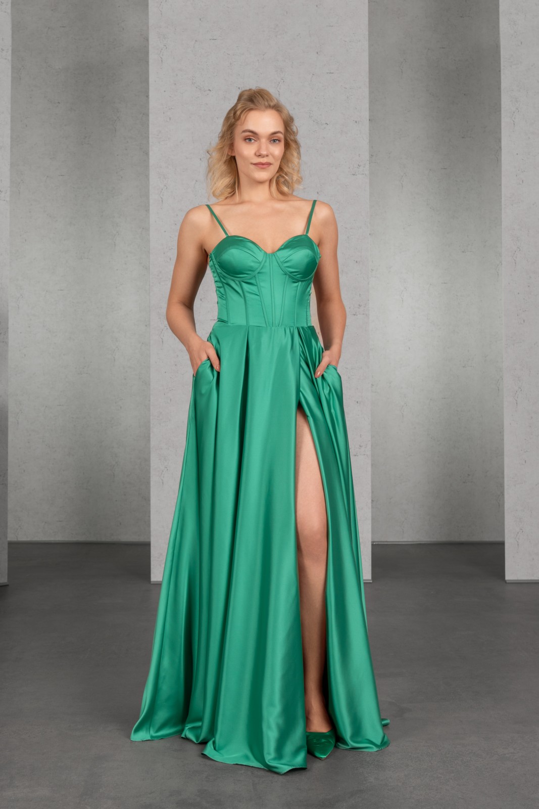 Aufgesetzte Stäbchen betonen die Korsage mit schmalen Trägern und der weite Rock mit Seitentaschen und Wickelschlitz vervollständigt das Abendkleid in der Farbe Grün aus weichem Softsatin.