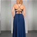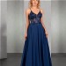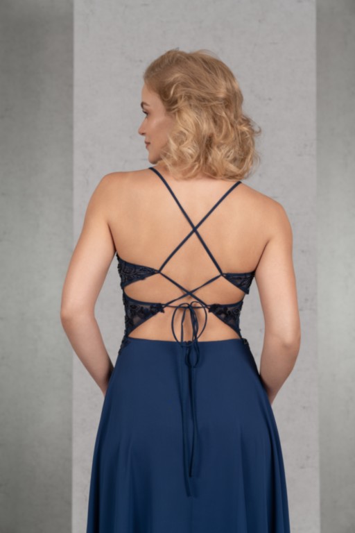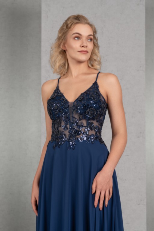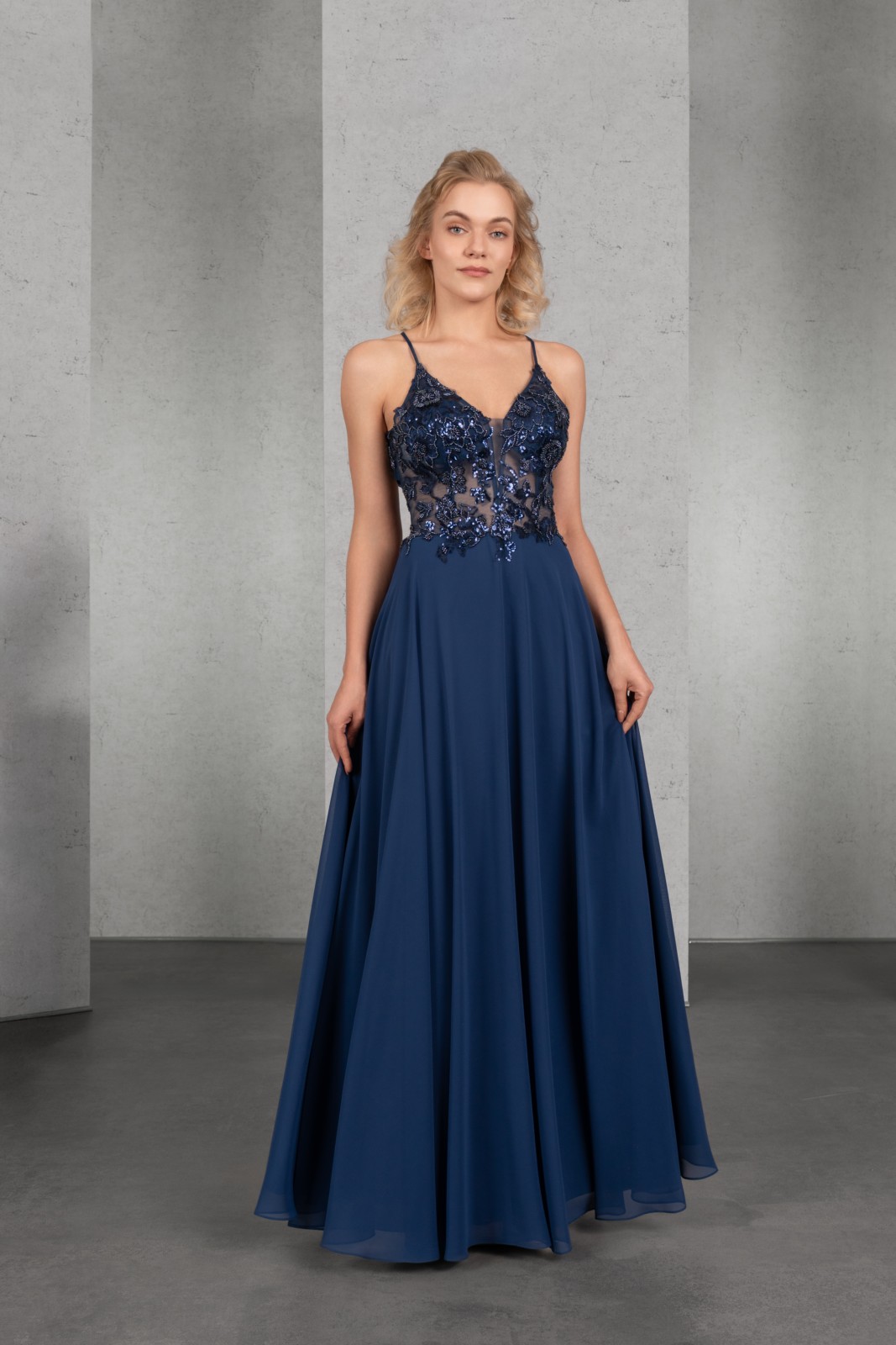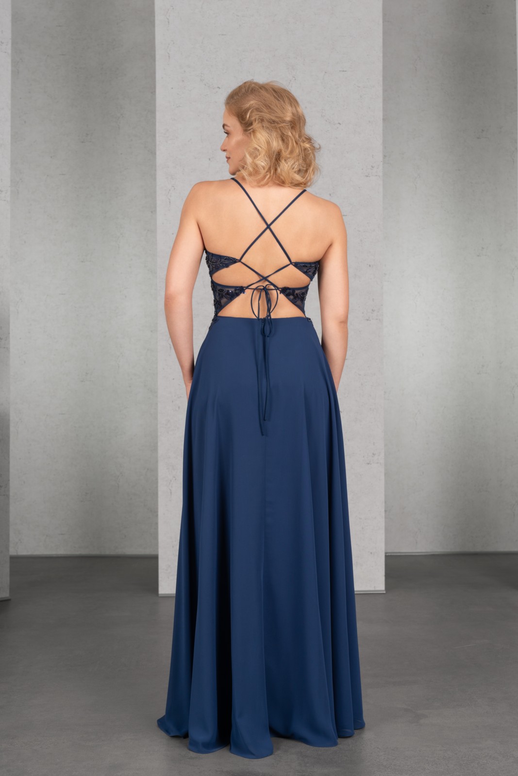 Das transparente Top mit sichtbaren Stäbchen und tiefem Cut-Out ist mit perlenbestickter Spitze besetzt, die schmalen Träger unterstreichen den zarten Look. Vervollständigt wird das aufregende Abendkleid in der Farbe Nachtblau durch einen weiten Rock aus fließendem Chiffon.