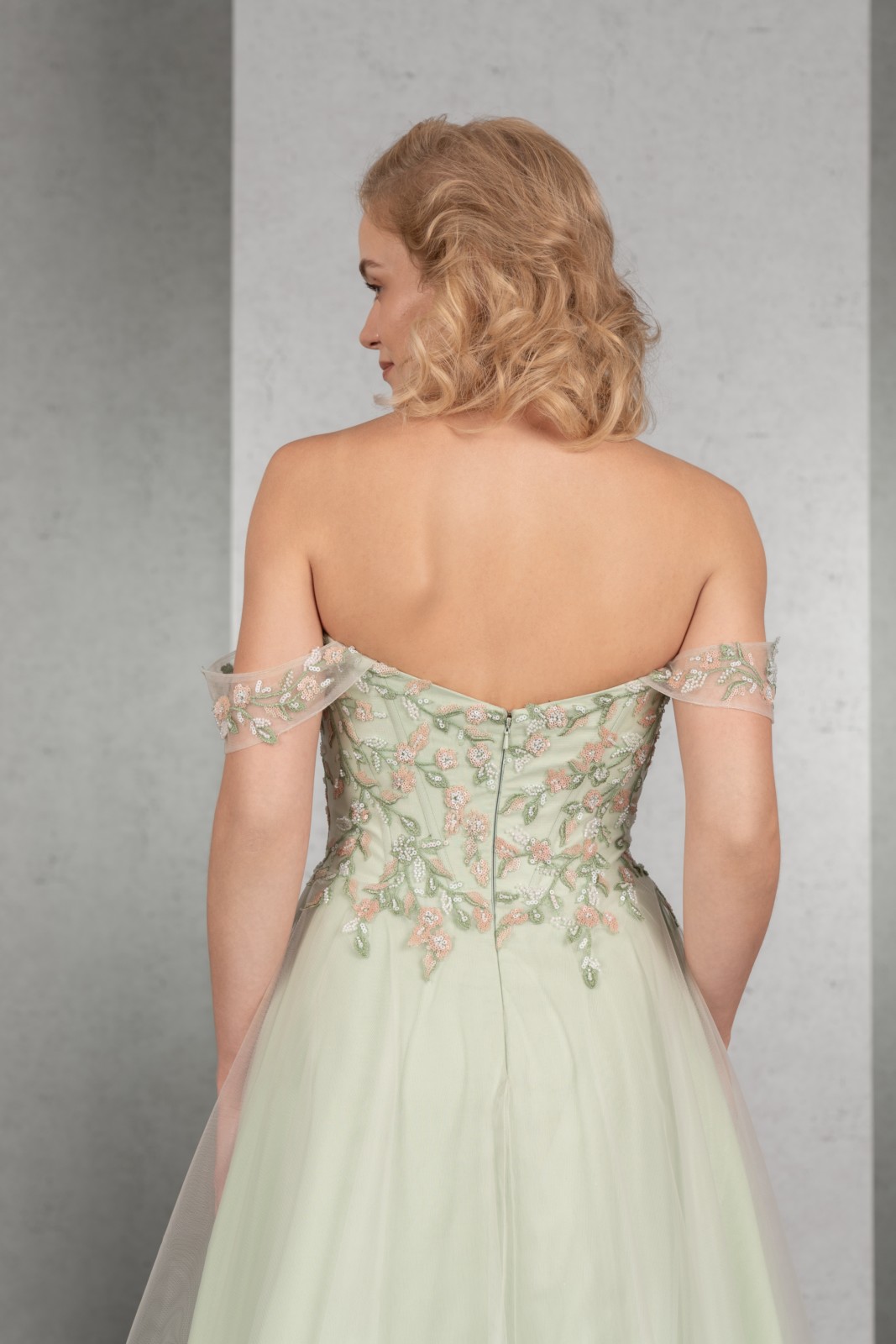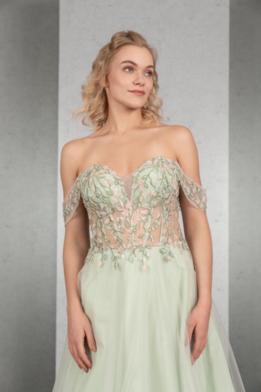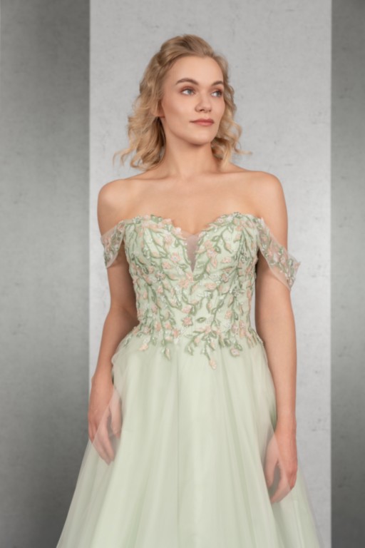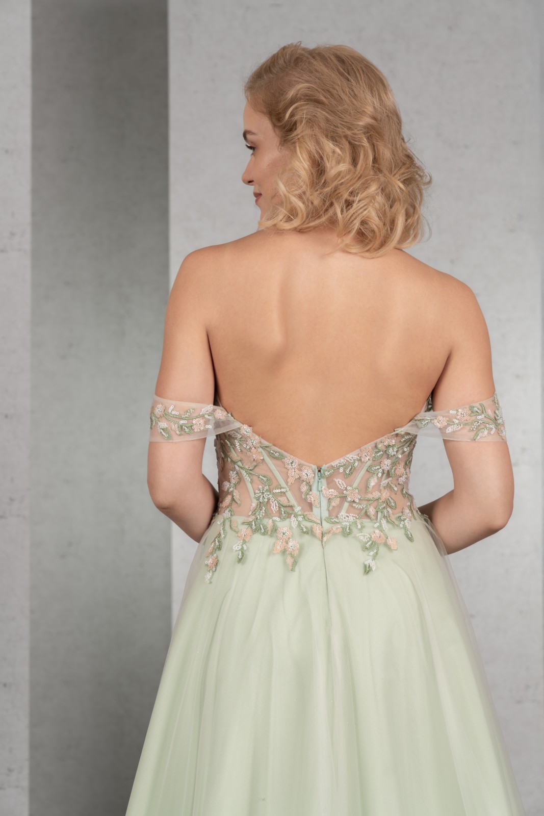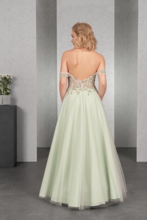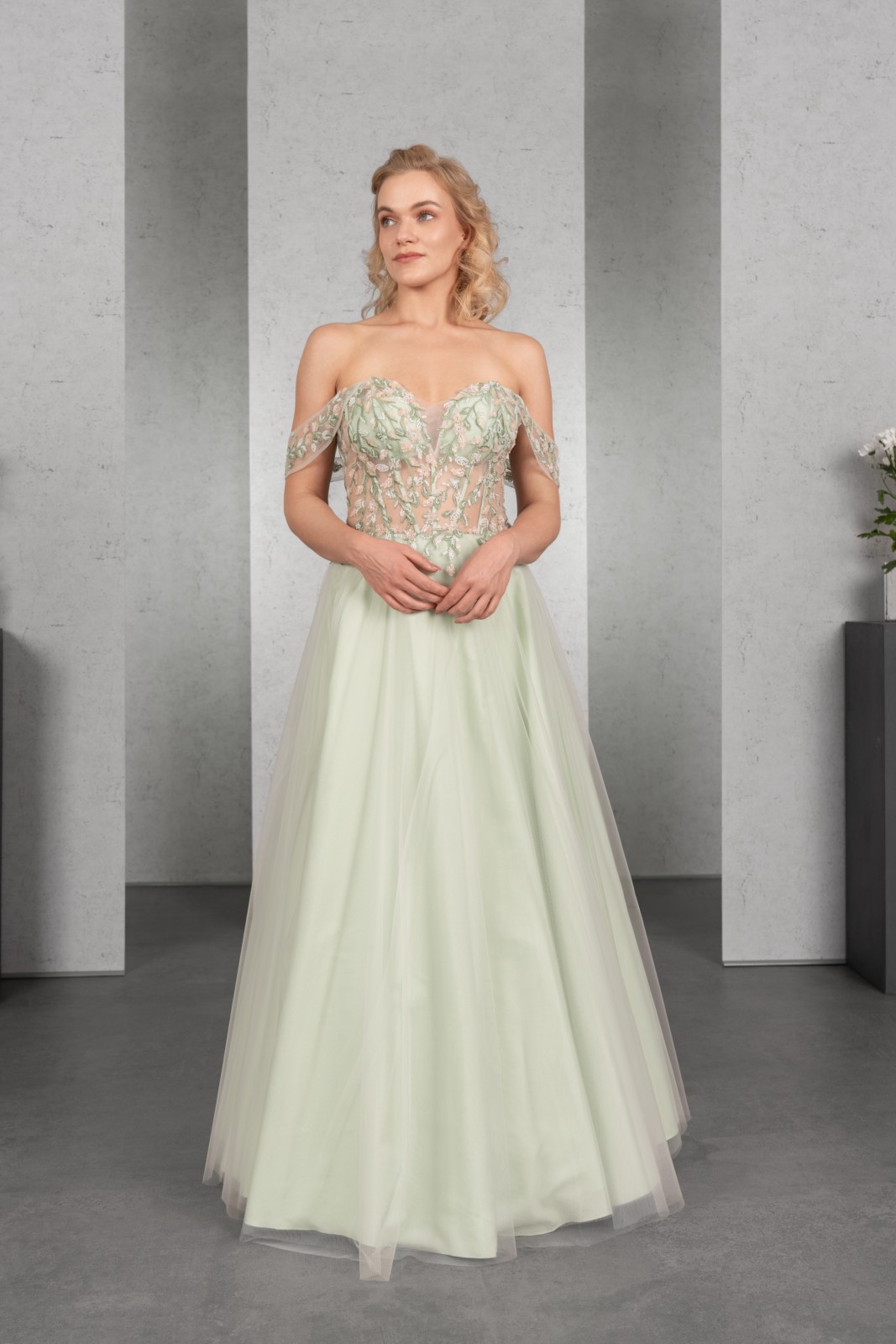 Blätterförmige Perlenstickerei in einzigartiger Farbkomposition sorgen für den besonderen Touch des extravaganten Ballkleides in der Farbe Hellgrün. Das transparente Top mit sichtbaren Stäbchen und tiefem Rücken wird durch einen weiten Tüllrock perfekt in Szene gesetzt. Ein besonderer Clou sind die abnehmbaren Carmenträger.