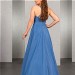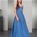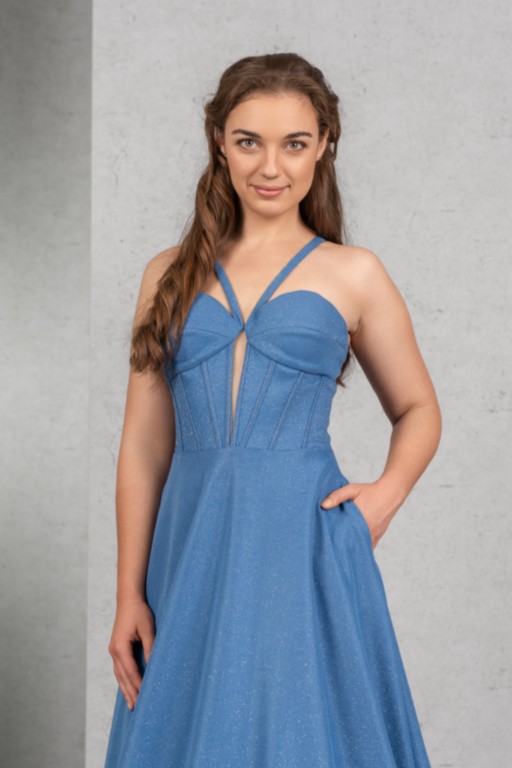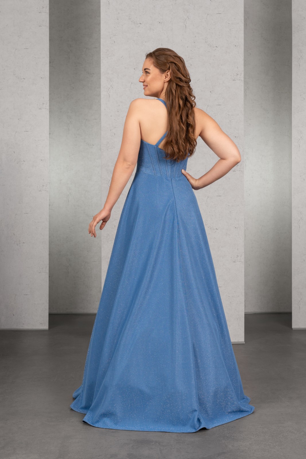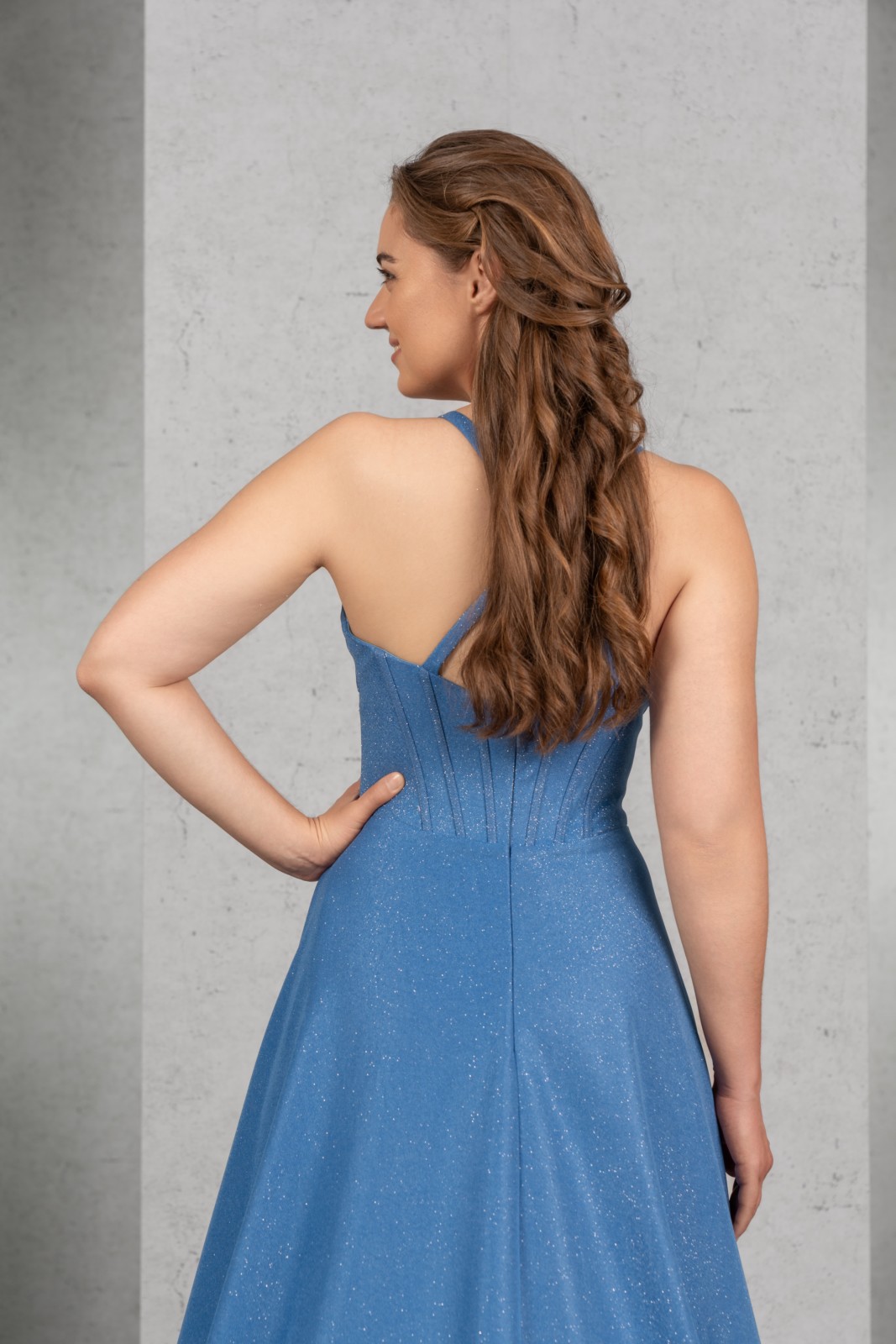 Aufgesetzte Stäbchen betonen die Korsage mit taillentiefem Cut-Out, die raffinierten Träger und der weite Rock mit Seitentaschen vervollständigt das Abendkleid aus Glitzerjersey in der Farbe Denim.