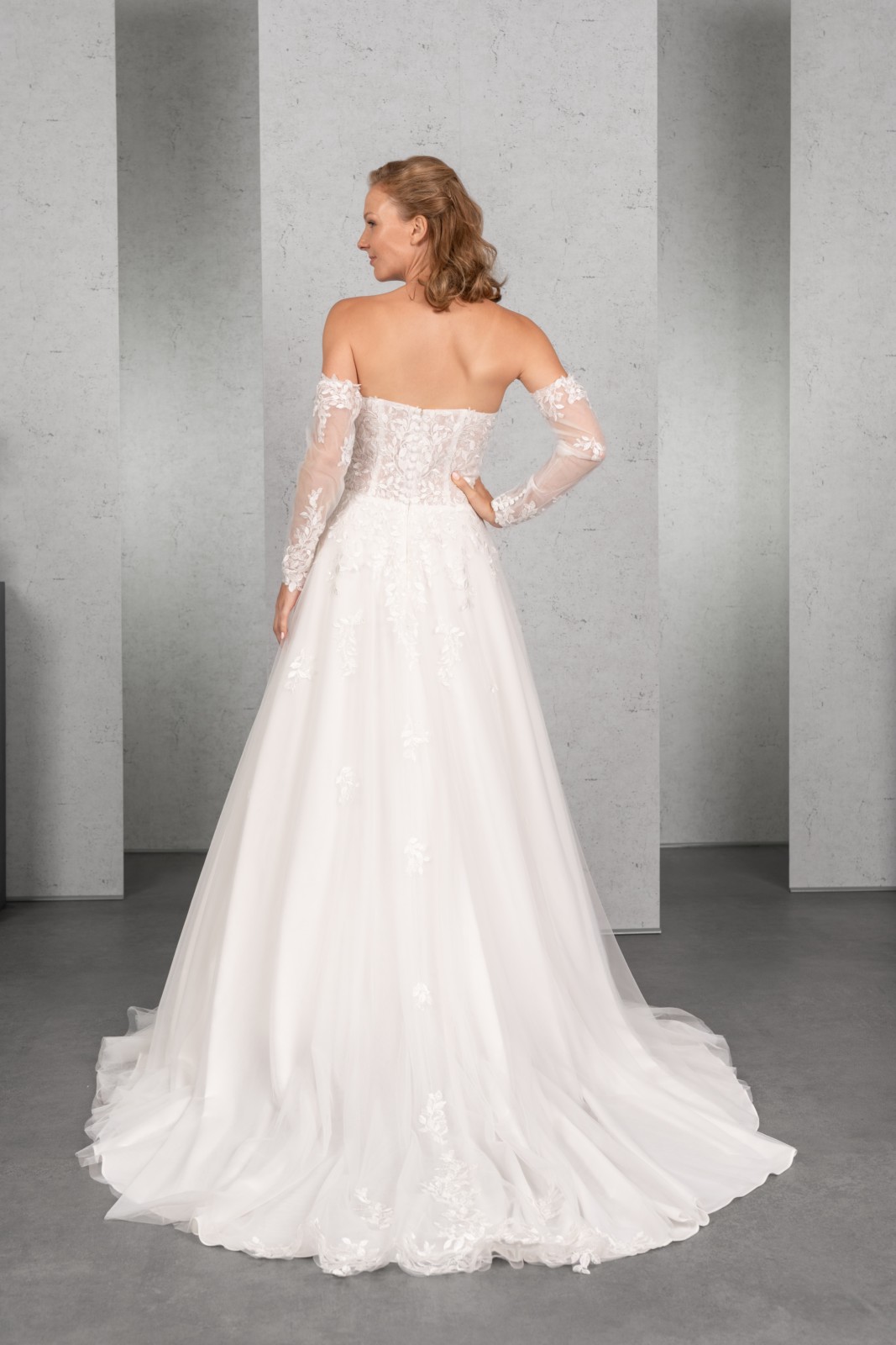Das transparente Top ist mit Paillettenspitze unterlegt und aufwendig mit blätterförmiger Spitze besetzt, die sich auf der Schleppe des weiten Tüllrocks wiederholt. Die abnehmbaren langen Ärmel vervollständigen das romantische Brautkleid perfekt.